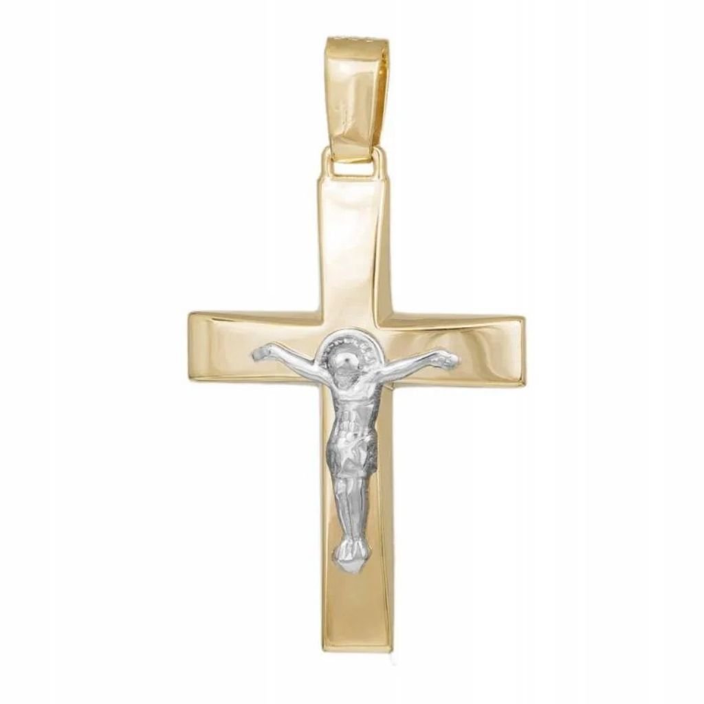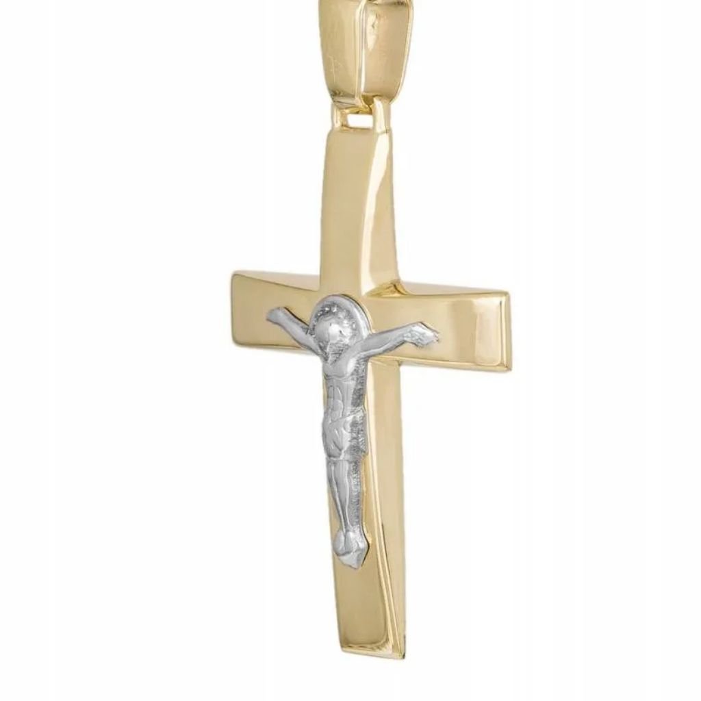 Δίχρωμος ανδρικός σταυρός από χρυσό και λευκόχρυσο 9 καρατίων, με λουστρέ φινίρισμα, διακοσμημένος με τον Εσταυρωμένο. Ιδανική επιλογή για δώρο βάπτισης ή αρραβώνα.