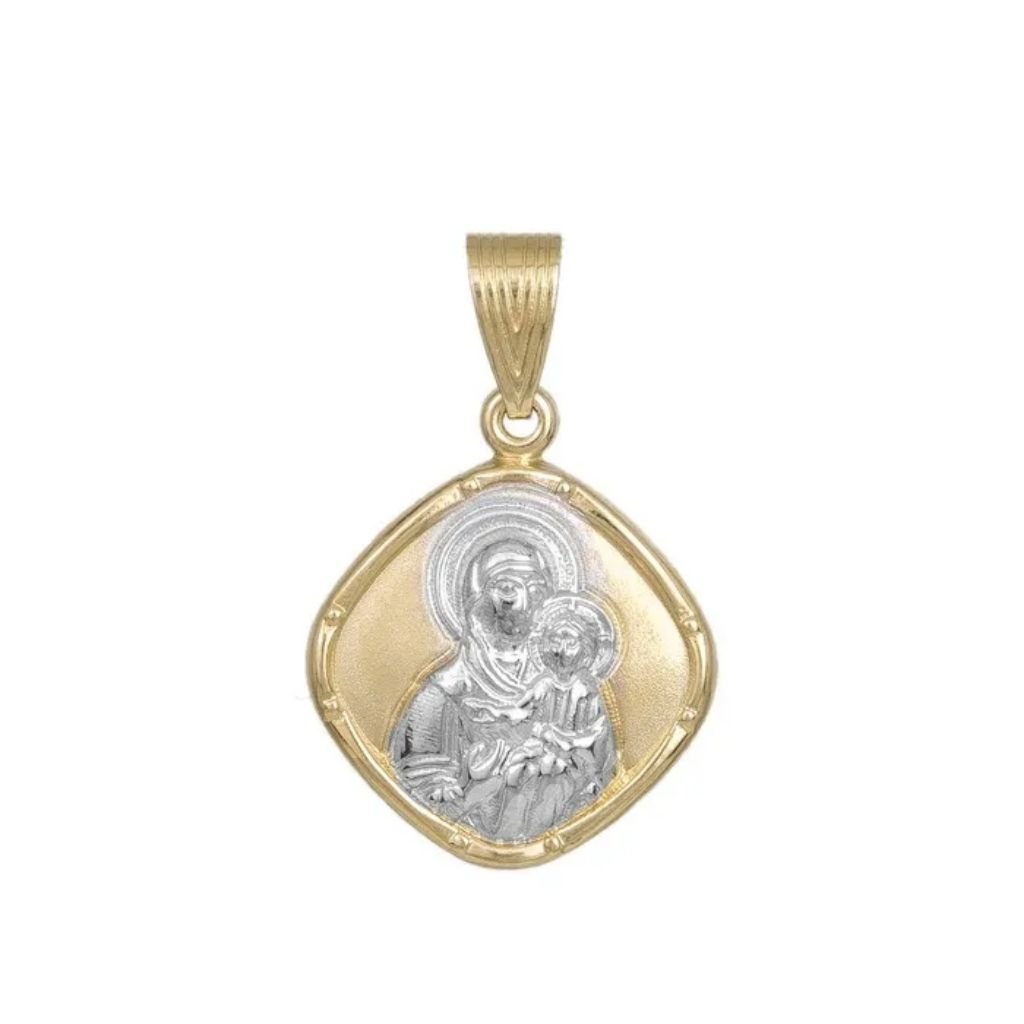Υπέροχο δίχρωμο κρεμαστό Κωνσταντινάτο από χρυσό και λευκόχρυσο 9 καρατίων, που απεικονίζει την Βρεφοκρατούσα, σε σχήμα ρόμβου με λουστρέ και ανάγλυφες λεπτομέρειες!