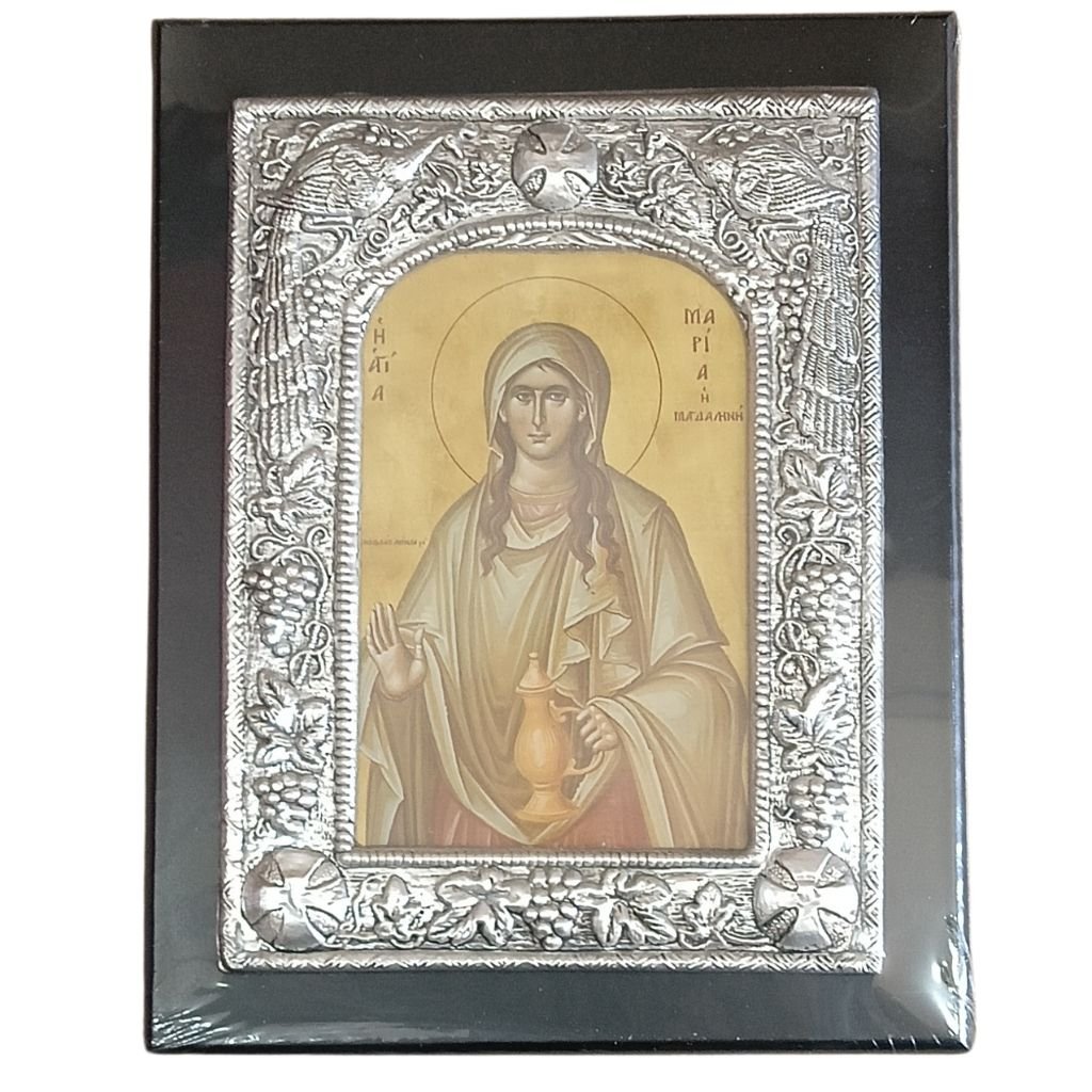 Εκλεπτυσμένη εικόνα της Αγίας Μαρίας της Μαγδαληνής, απεικονισμένη με δοχείο μύρου, σύμβολο πίστης και μετανοίας. Πλαισιωμένη με ανάγλυφο μεταλλικό σχέδιο σε ασημί απόχρωση και τοποθετημένη σε μαύρο ξύλινο πλαίσιο.