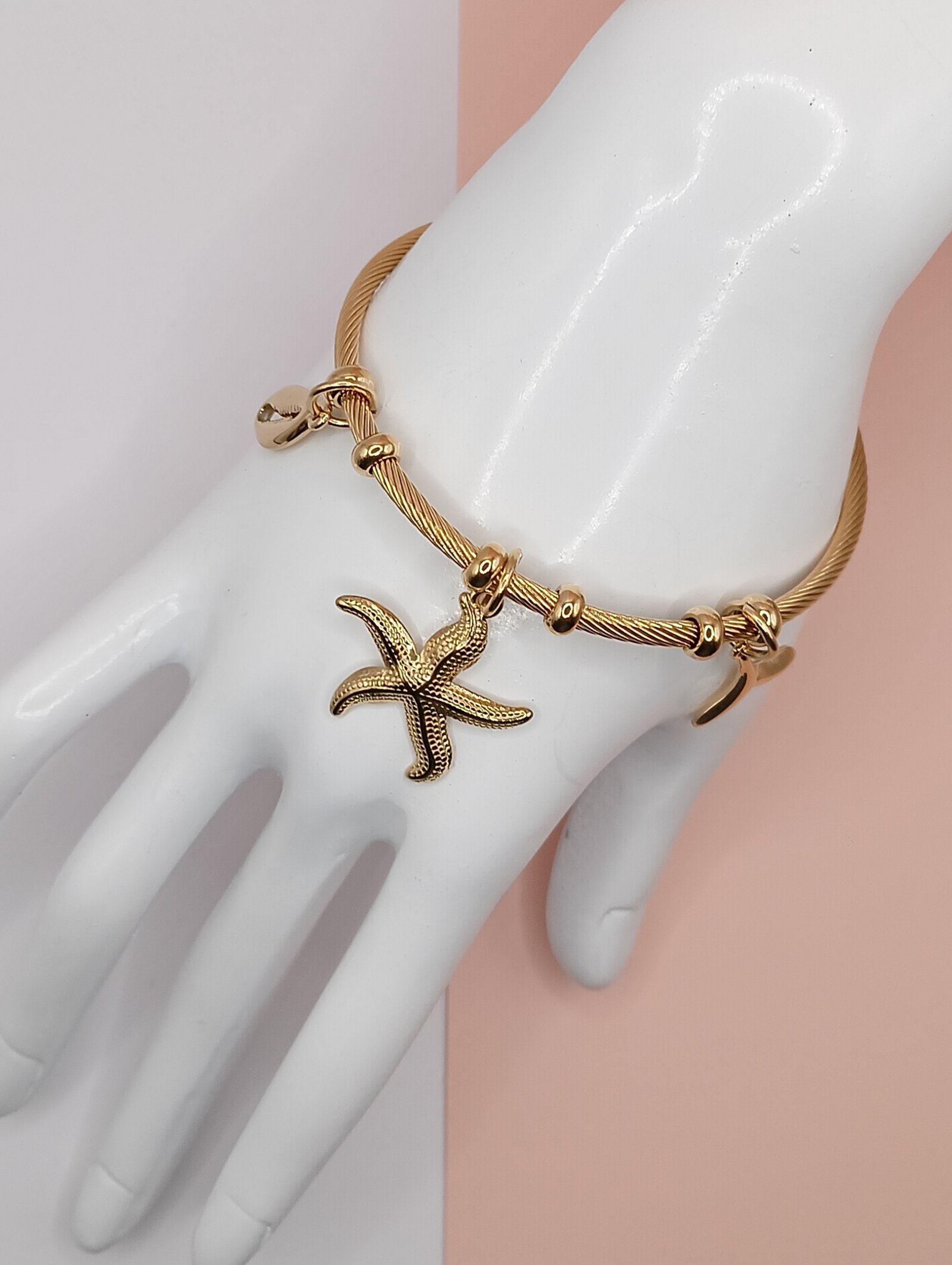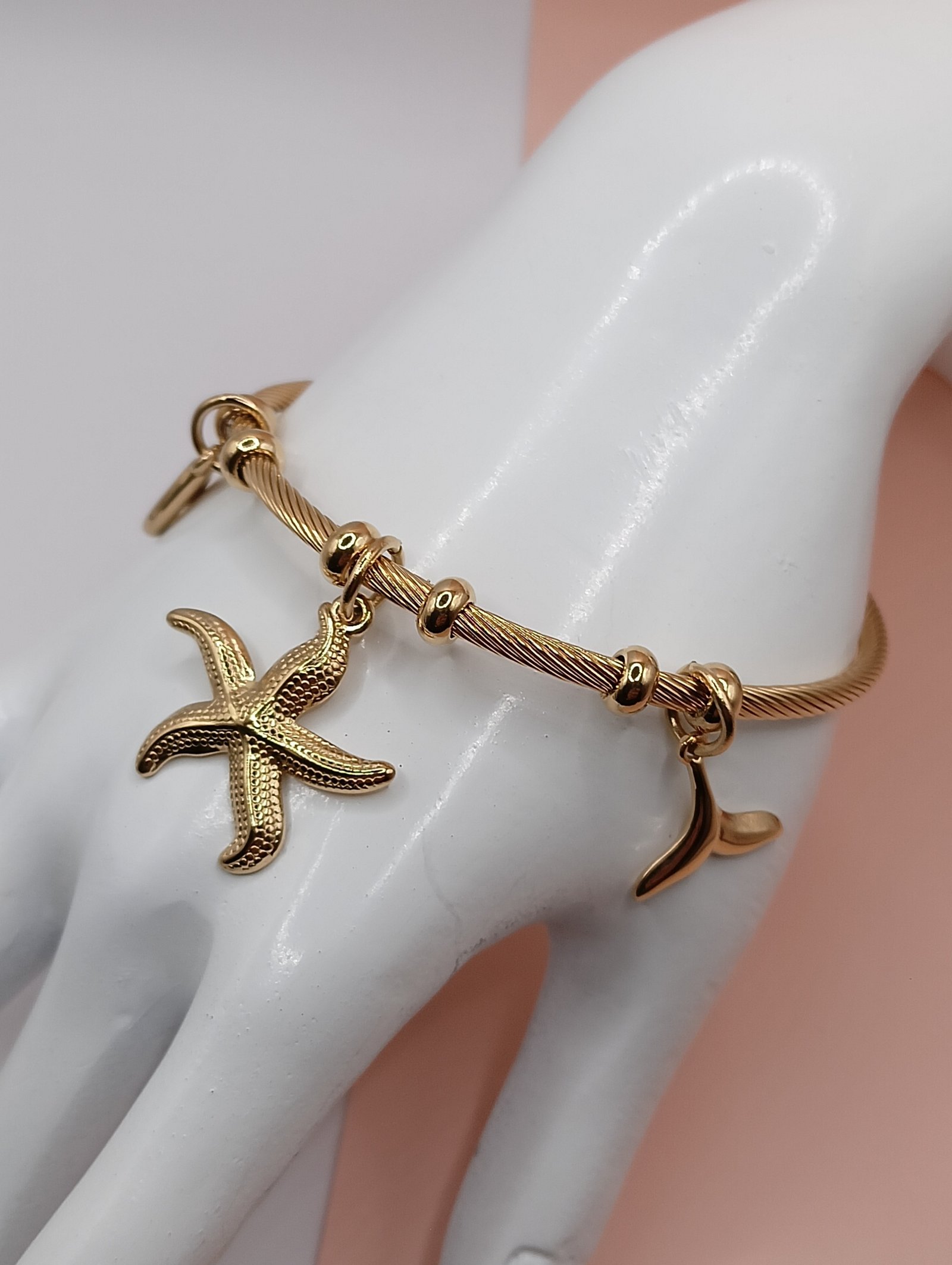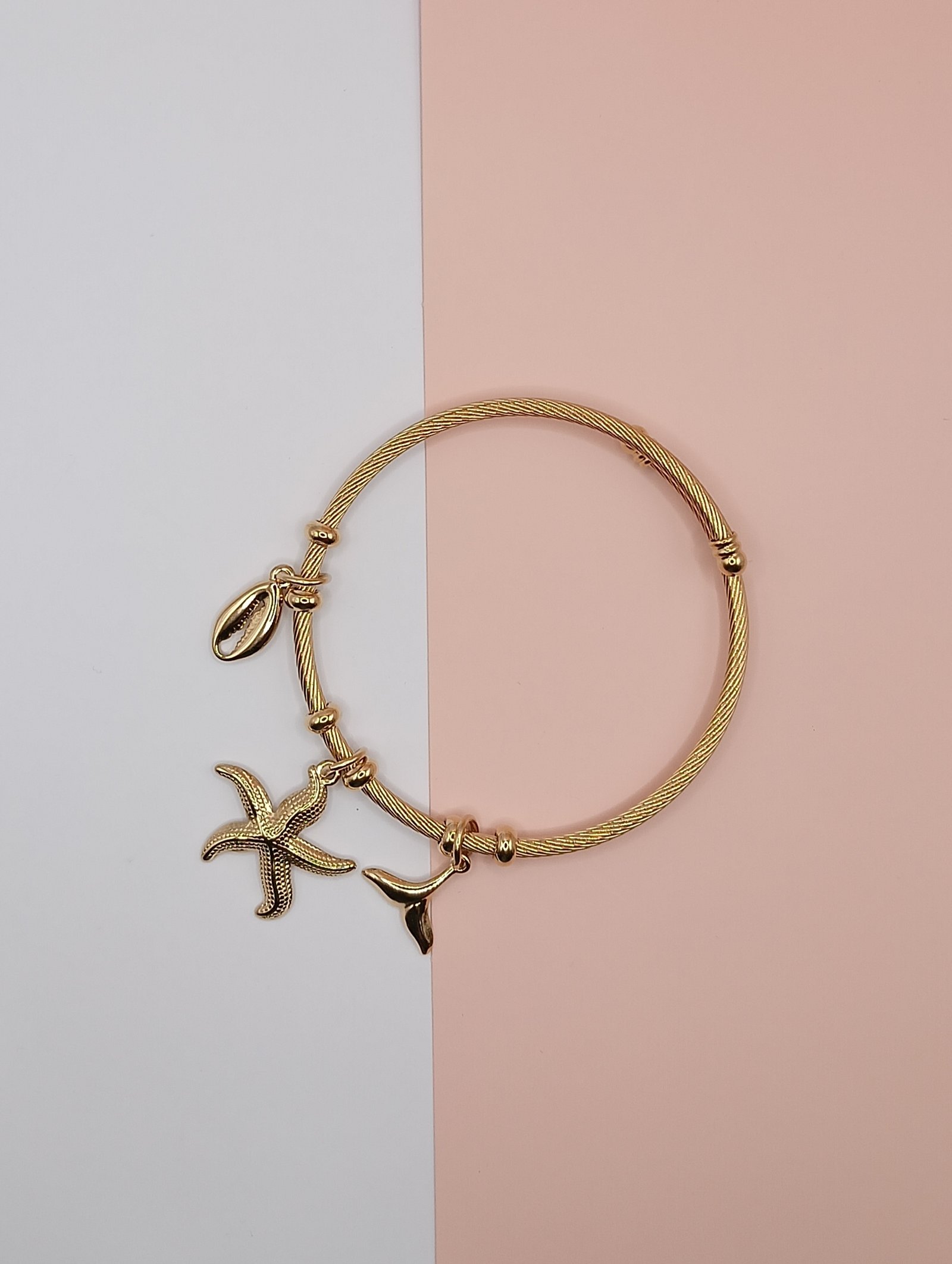 Καλοκαιρινό και λαμπερό, αυτό το βραχιόλι από επιχρυσωμένο ατσάλι συνδυάζει κοχύλι, αστερία και ουρά γοργόνας