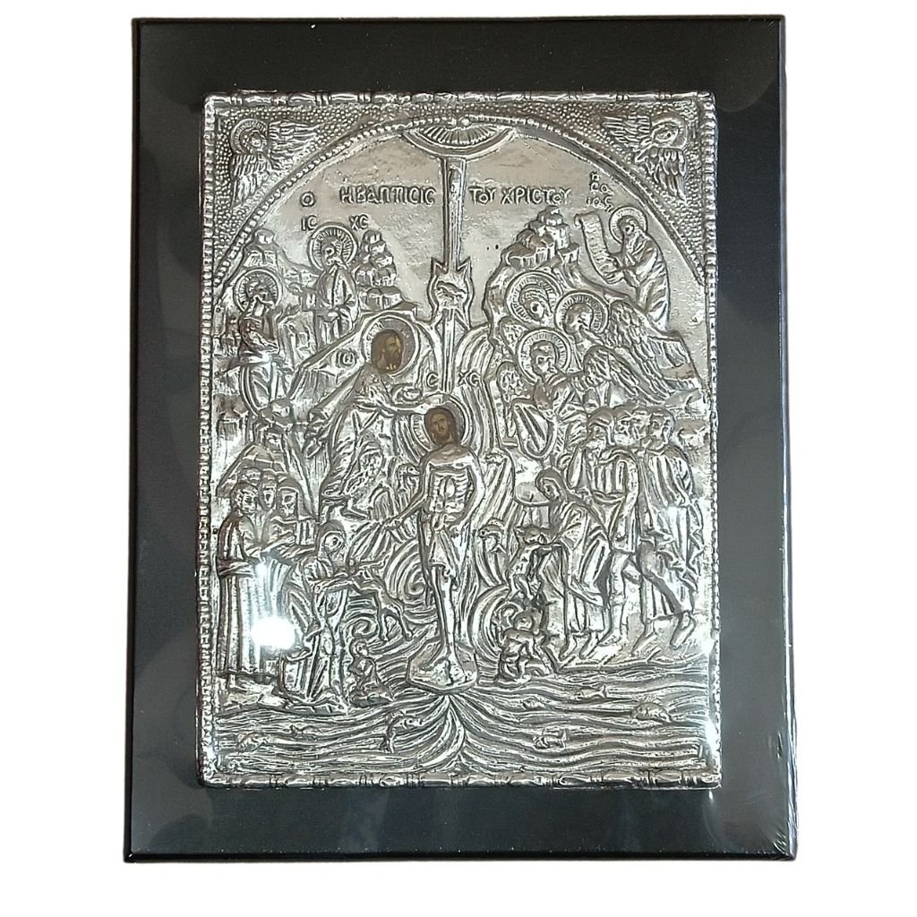 Εντυπωσιακή εικόνα με παράσταση της Βάπτισης του Χριστού, φιλοτεχνημένη σε λεπτομερή ανάγλυφη απεικόνιση. Τοποθετημένη σε κομψό μαύρο ξύλινο πλαίσιο, αποτελεί πρόταση για δώρο ή για τον χώρο λατρείας σας.