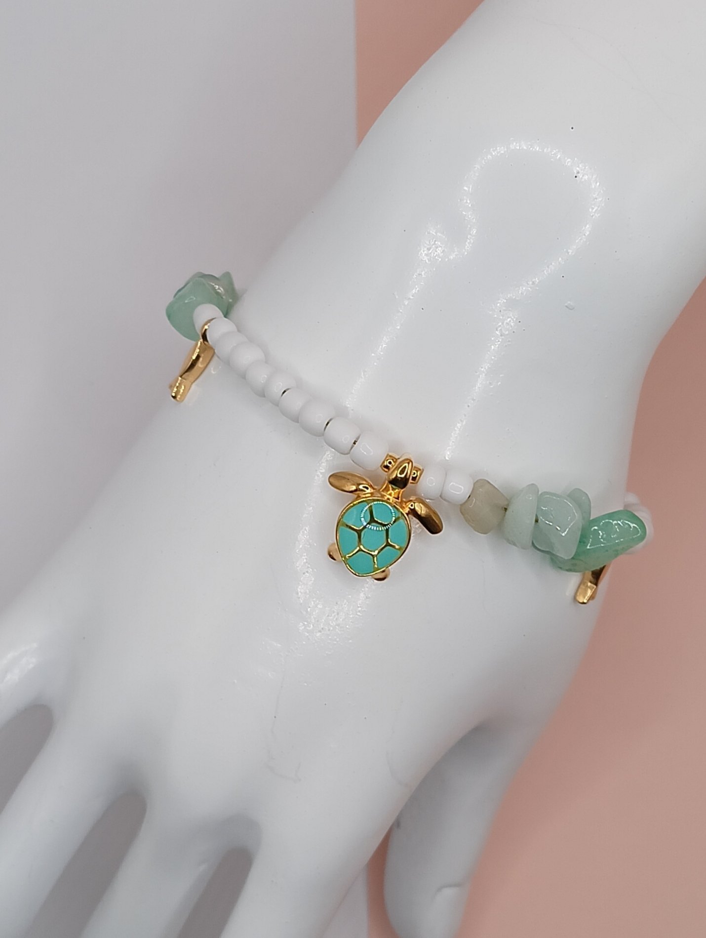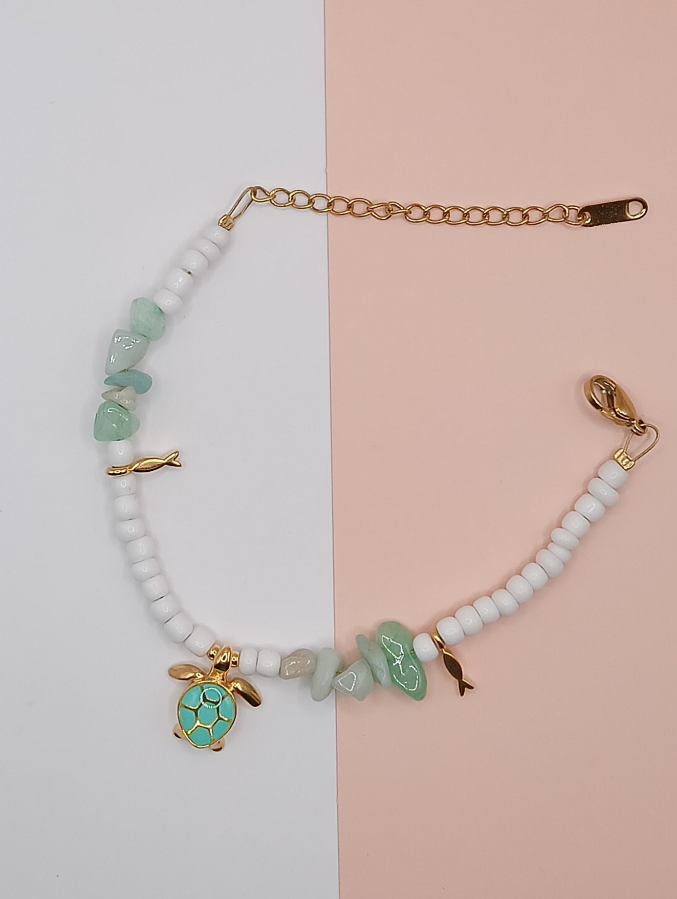 Χειροποίητο βραχιόλι με λευκές και πράσινες πέτρες χαολίτη, διακοσμημένο με χρυσή χελώνα τυρκουάζ και λεπτομέρειες ψαριών.