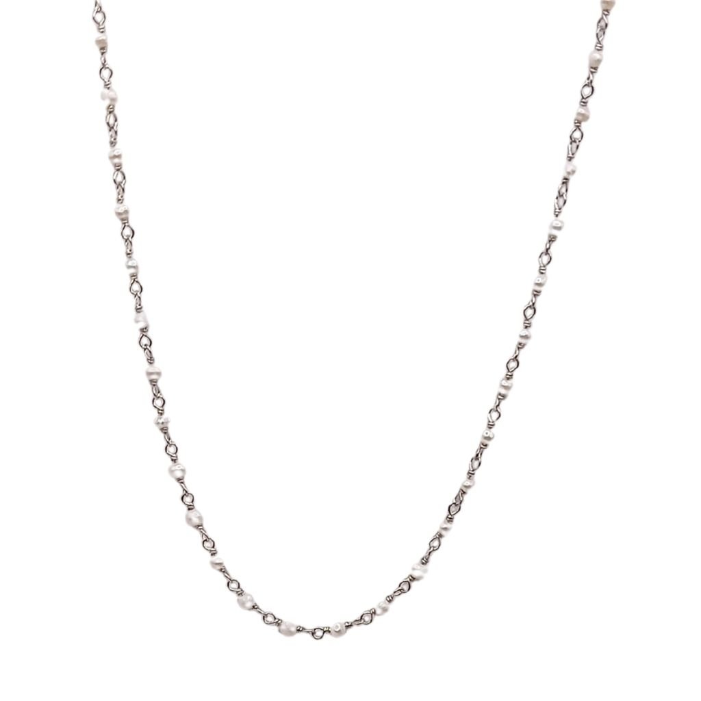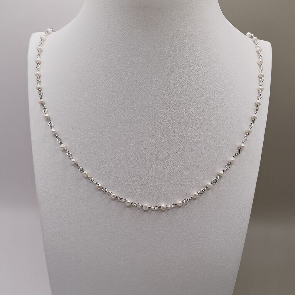 Κομψό και ρομαντικό κολιέ από ασήμι 925, διακοσμημένο με μικρά φυσικά μαργαριτάρια σε όλο του το μήκος. Το ιδανικό κόσμημα για διακριτική λάμψη και θηλυκότητα, είτε φοριέται μόνο του είτε σε layering.