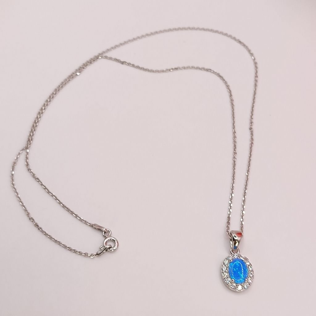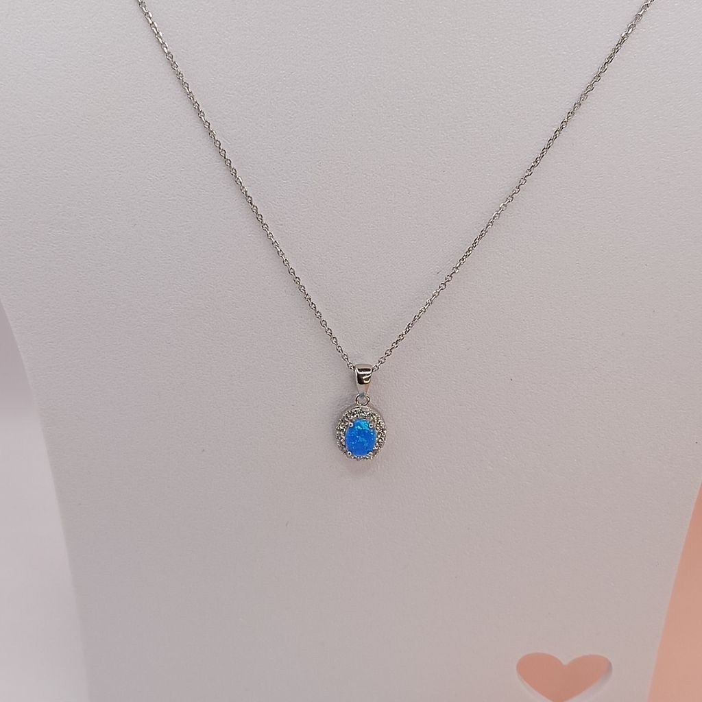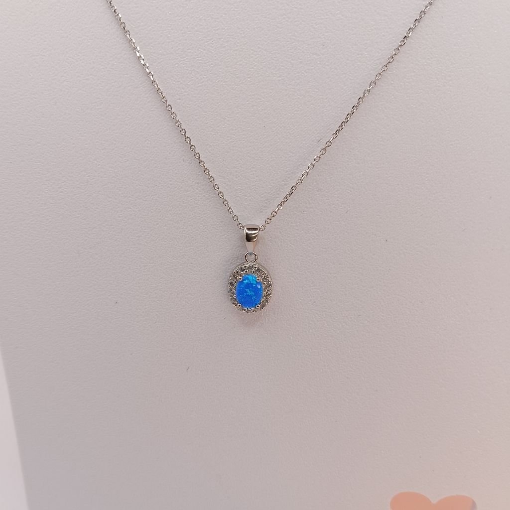 Κομψό κολιέ από ασήμι 925 με αλυσίδα μήκους 50 εκ. και εντυπωσιακό μενταγιόν. Το μενταγιόν διαθέτει κεντρική πέτρα από μπλε οπάλιο που ακτινοβολεί μοναδική λάμψη, πλαισιωμένη από λαμπερά λευκά ζιργκόν. Ιδανικό για καθημερινή χρήση αλλά και για πιο ιδιαίτερες εμφανίσεις, χαρίζοντας διακριτική πολυτέλεια.