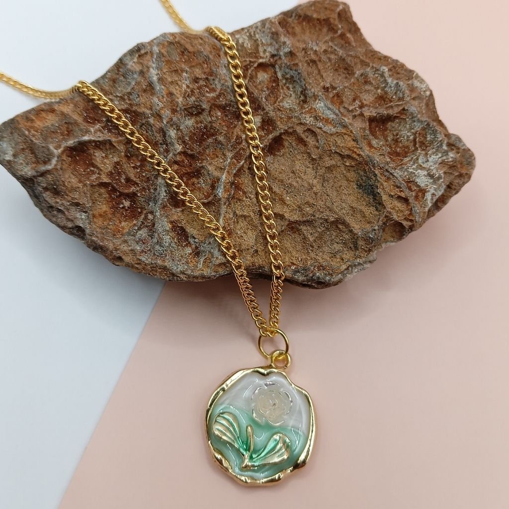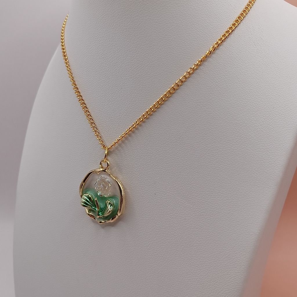 ομψό κολιέ από ανοξείδωτο ατσάλι με χρυσή αλυσίδα και ιδιαίτερο μενταγιόν που αποτυπώνει ένα λουλούδι σε διάφανο και πράσινο σμάλτο.