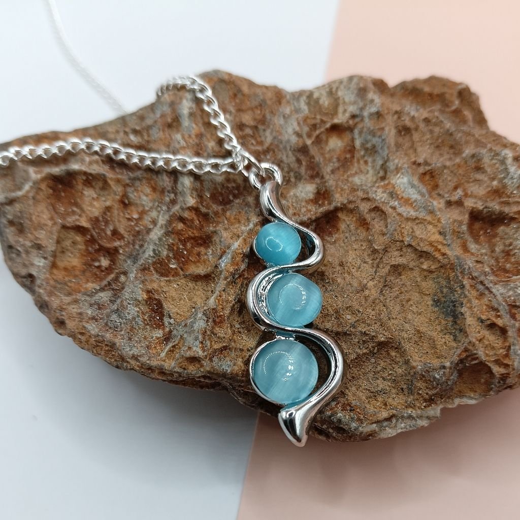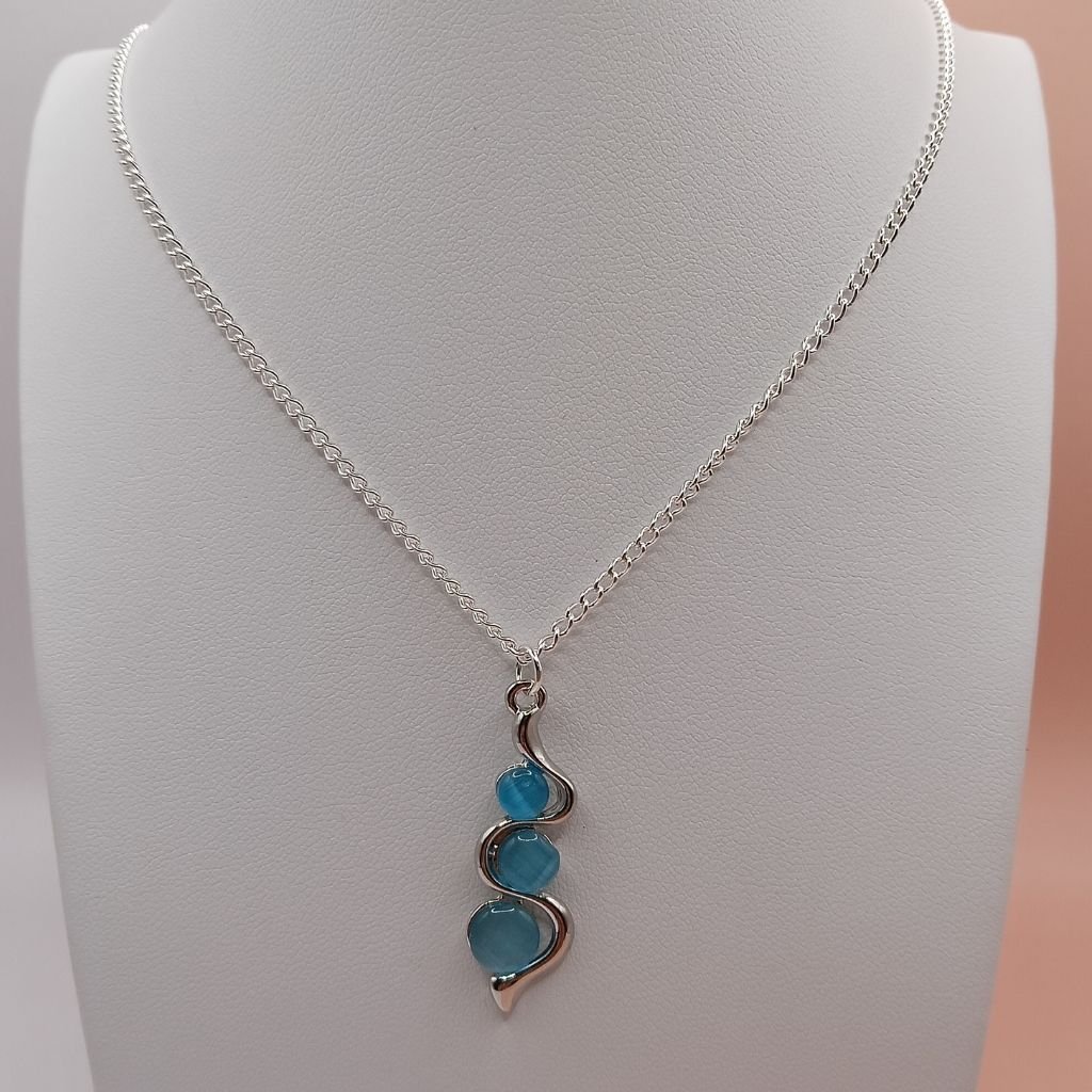 Εντυπωσιακό κολιέ από ανοξείδωτο ατσάλι με ιδιαίτερο μενταγιόν που αγκαλιάζει τρεις μπλε πέτρες σε σχήμα σπείρας.