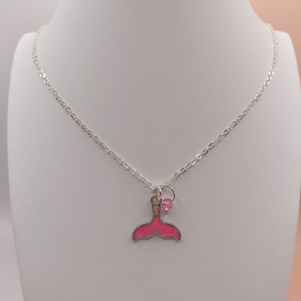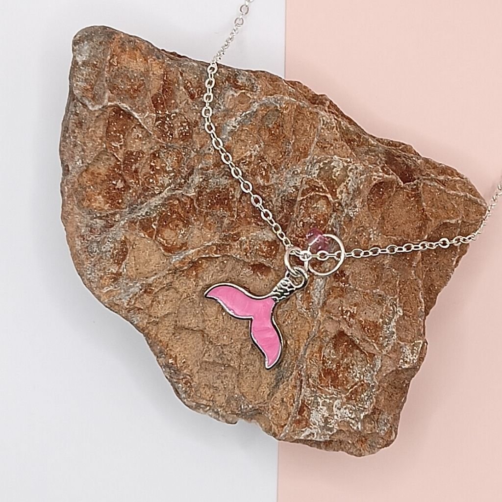 Κομψή αλυσίδα από ανοξείδωτο ατσάλι με μήκος 40 εκ. και μενταγιόν ουρά γοργόνας σε ροζ σμάλτο, συνοδευόμενο από μικρή ροζ χαντρούλα.