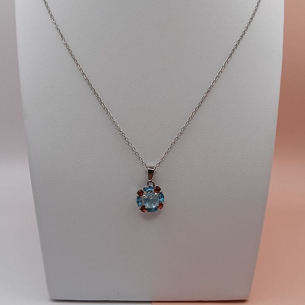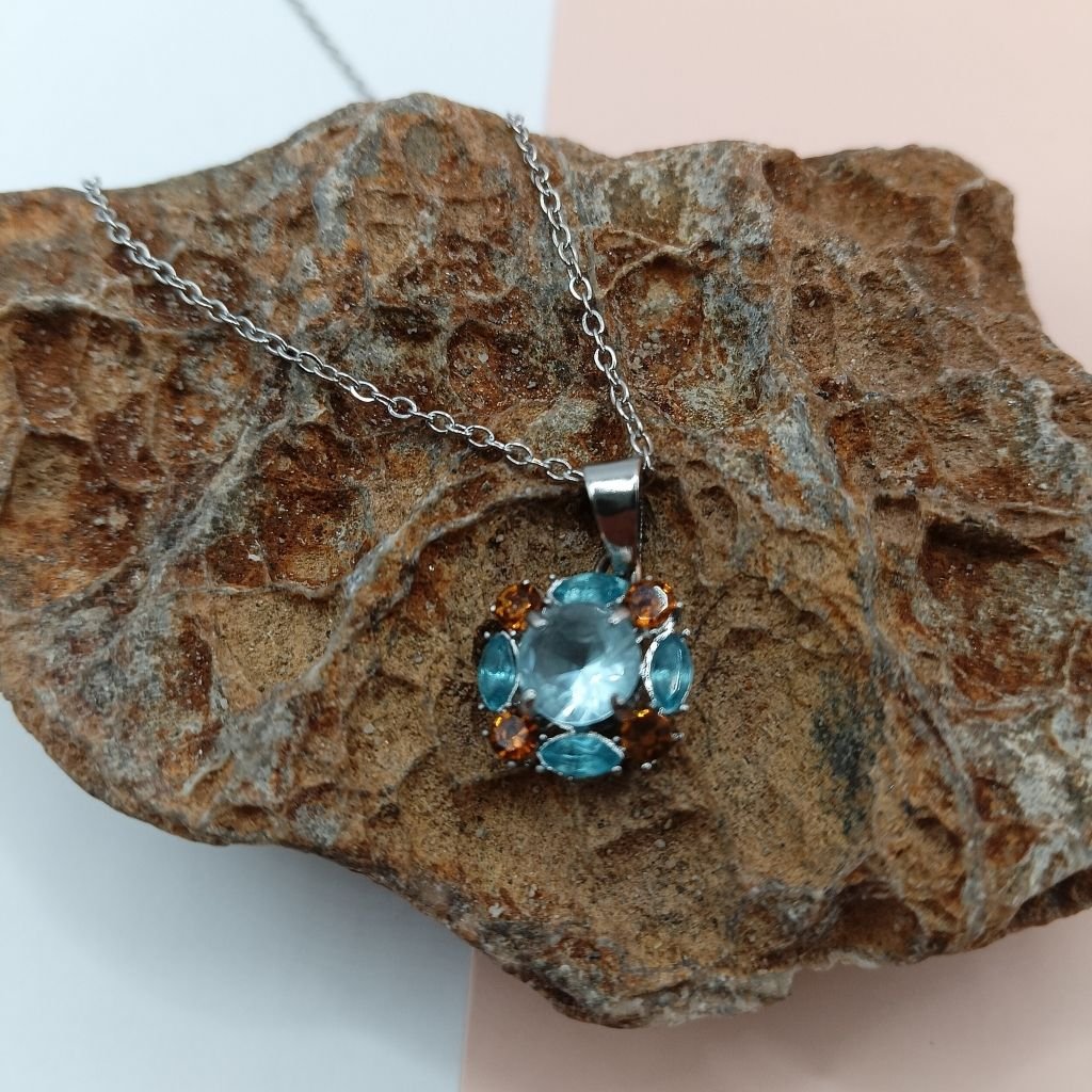 Κομψό κολιέ από ανοξείδωτο ατσάλι με λεπτή αλυσίδα και εντυπωσιακό μενταγιόν στολισμένο με πολύχρωμα ζιργκόν σε αποχρώσεις του γαλάζιου και του πορτοκαλί.