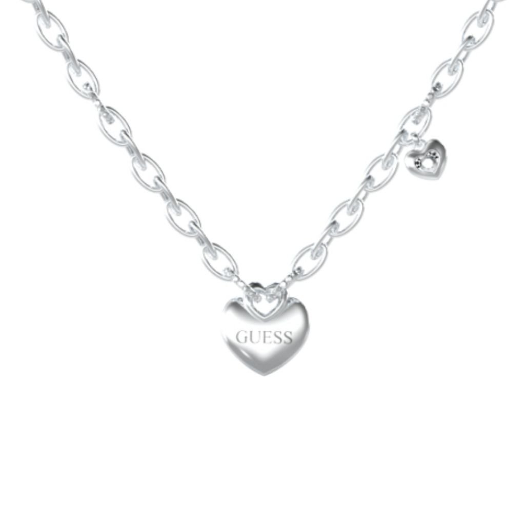Ρομαντικό κολιέ GUESS από ανοξείδωτο ατσάλι, με αλυσίδα σε chunky σχέδιο και διπλό στοιχείο καρδιάς —το ένα με χαραγμένο το λογότυπο GUESS και το άλλο διακοσμημένο με λευκό ζιργκόν. Ένα κόσμημα που συνδυάζει μοντέρνα αισθητική και θηλυκότητα, ιδανικό για να ολοκληρώσει κάθε εμφάνιση με στυλ.