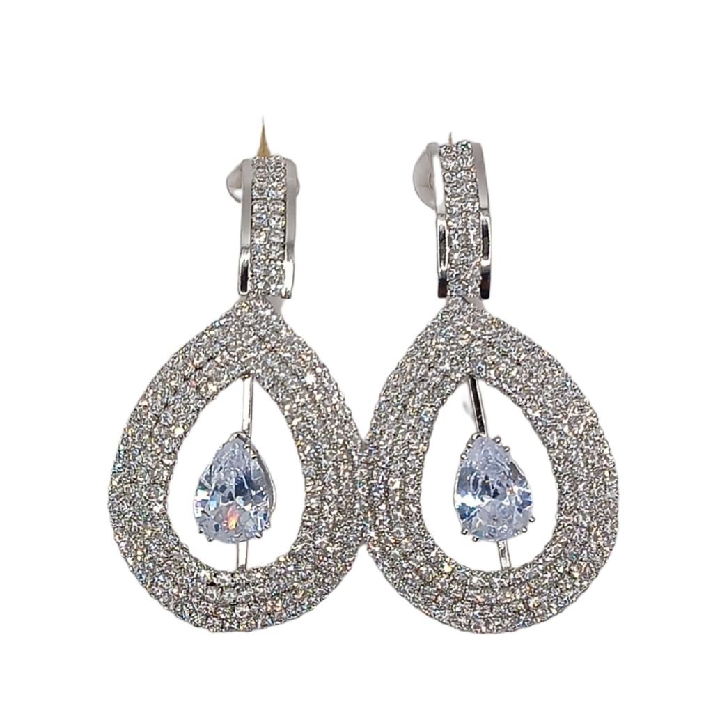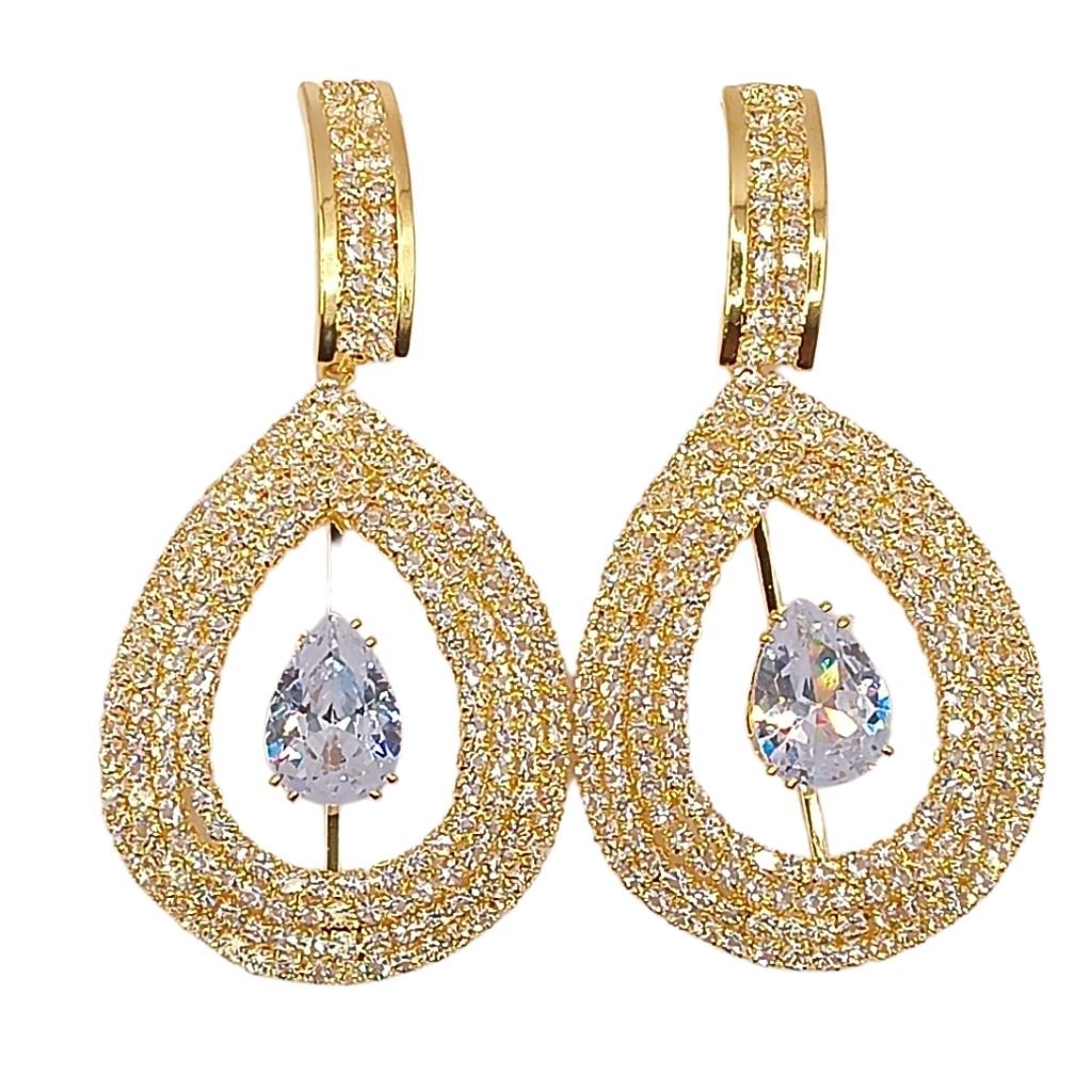 Λαμπερά σκουλαρίκια από ορείχαλκο, διακοσμημένα με πυκνά λευκά ζιργκόν σε δάκρυ σχήμα. Στο κέντρο αιωρείται ένα μεγάλο ζιργκόν σε σχήμα δάκρυ που δίνει κίνηση και πολυτέλεια. Ιδανικά για βραδινές εμφανίσεις και επίσημες περιστάσεις.