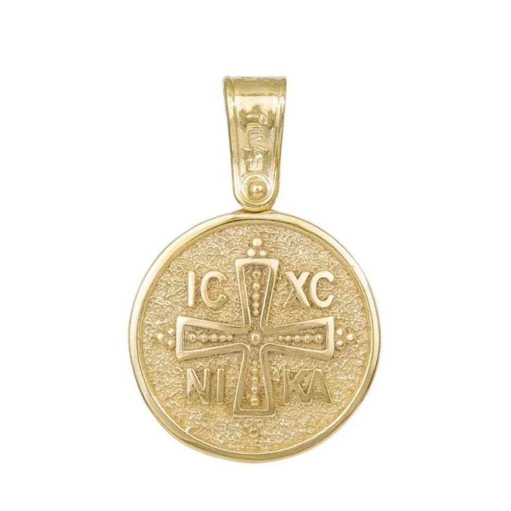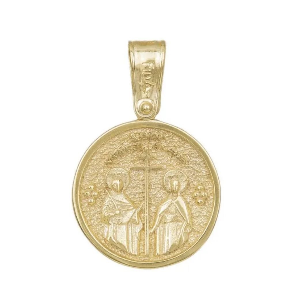 Χρυσό Κωνσταντινάτο 9 καρατίων σε σχέδιο διπλής όψης όπου συνδυάζει το ματ ανάγλυφο και τη λουστρέ επεξεργασία, υπέροχη επιλογή δώρου σε ενήλικα αλλά και σε ένα νεογέννητο μωρό.