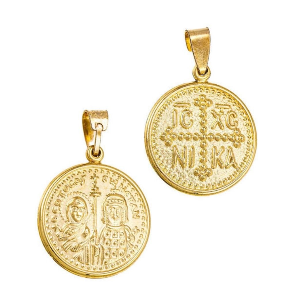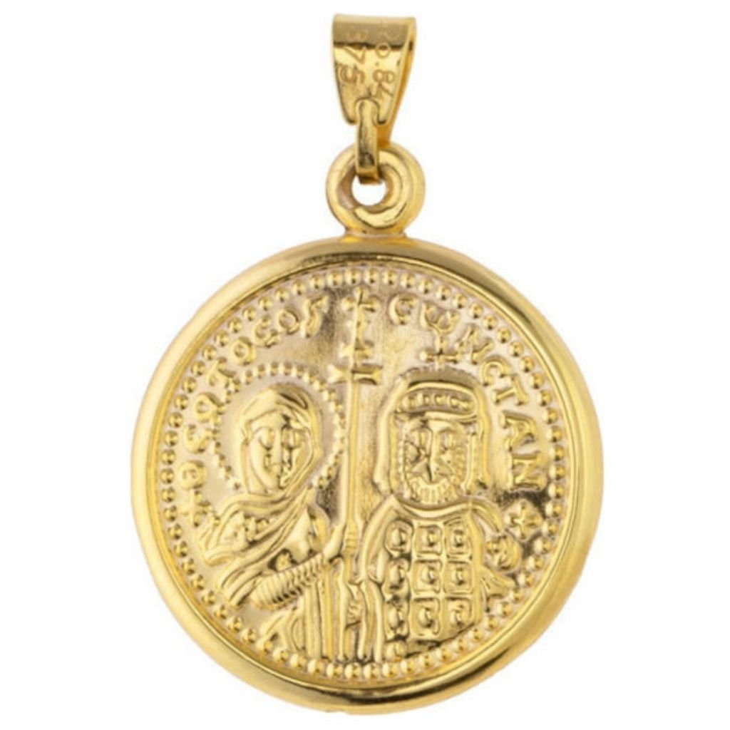 Κωνσταντινάτο από κίτρινο χρυσό 14 καρατίων, διπλής όψης, σε στρόγγυλο σχήμα, με το σχήμα του σταυρού στη μία όψη και την ανάγλυφη απεικόνιση του Αγίου Κωνσταντίνου και της Αγίας Ελένης στην άλλη όψη.