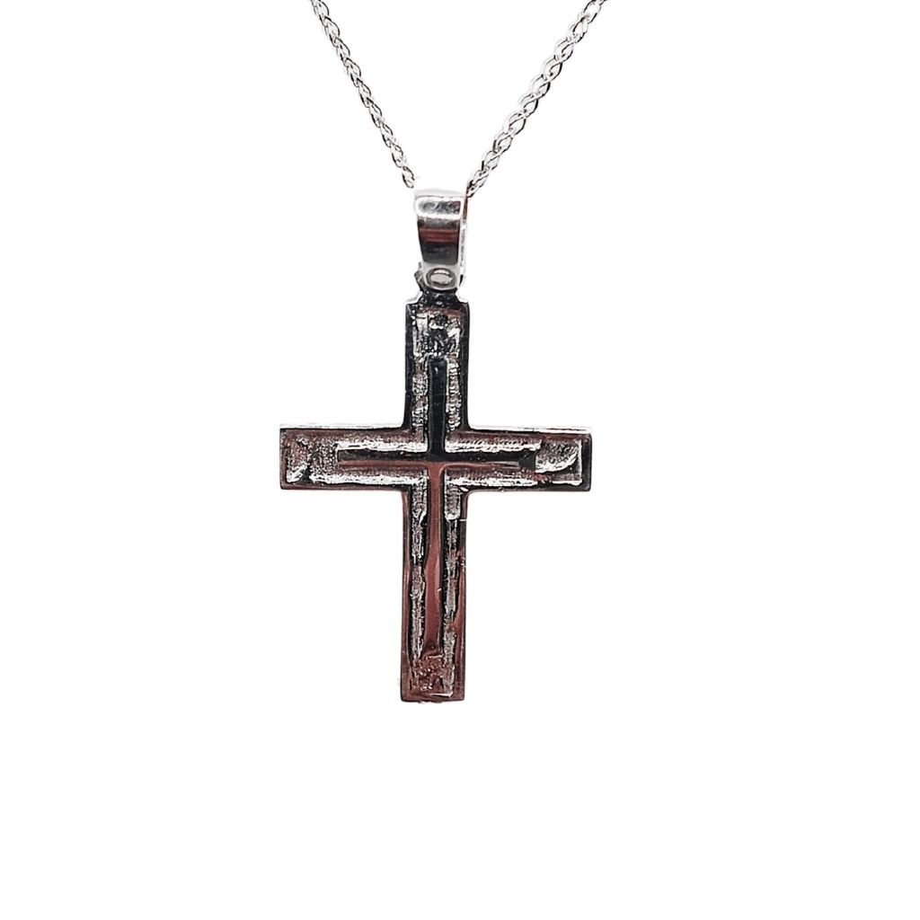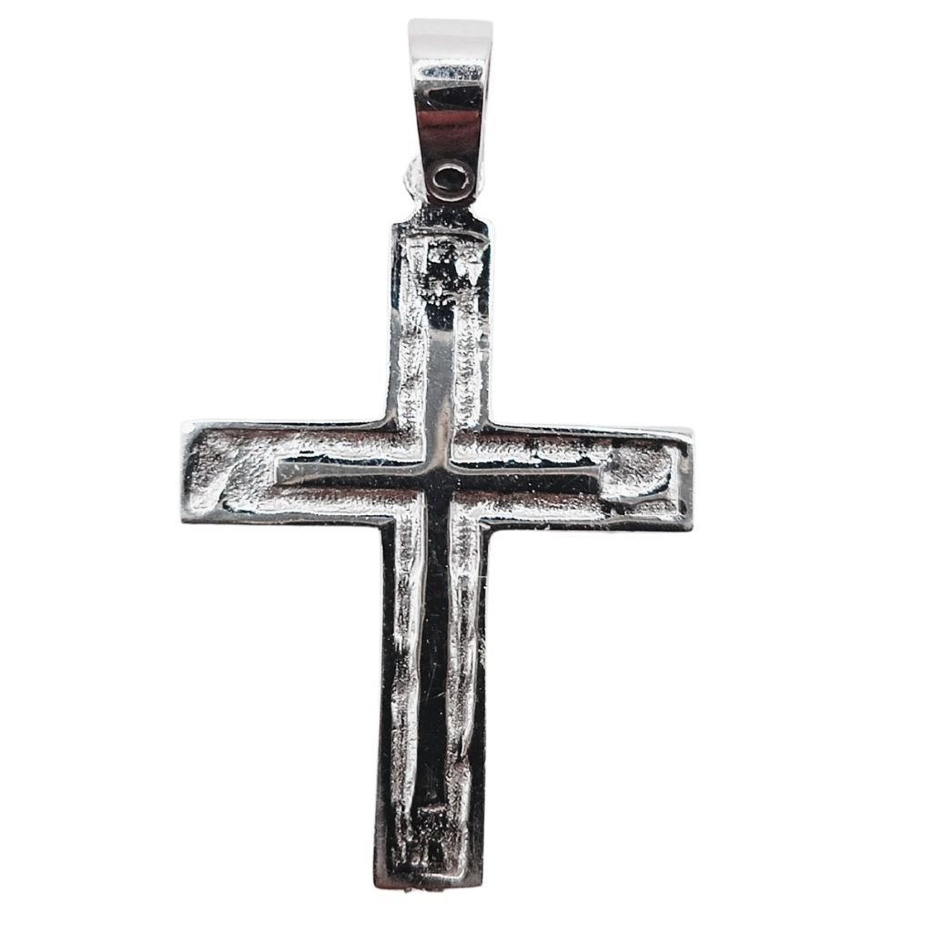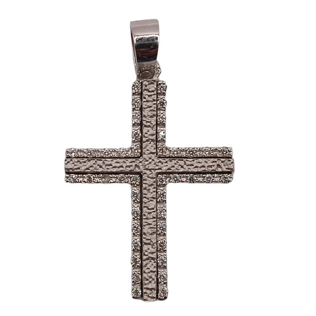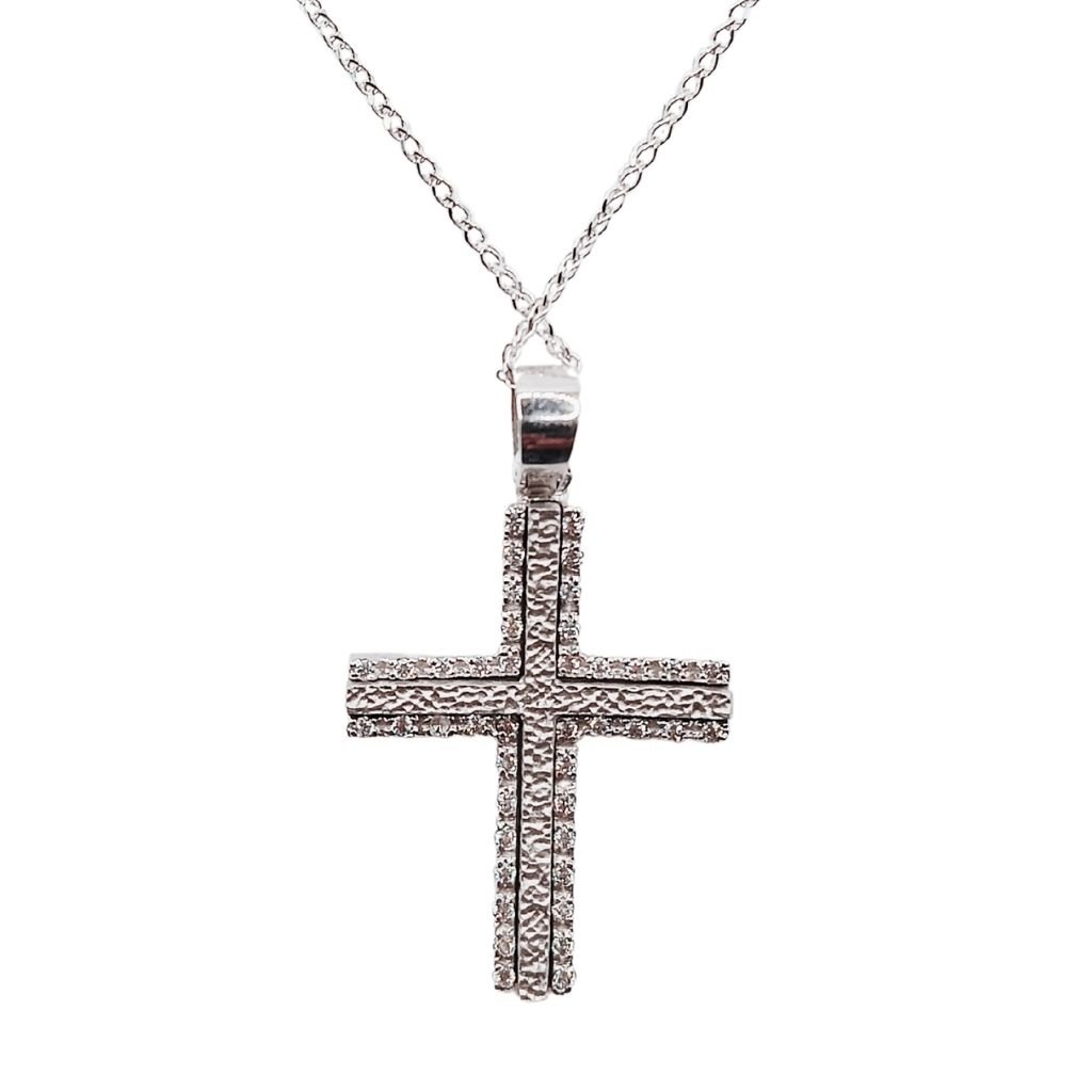 Ένας εντυπωσιακός λευκόχρυσος σταυρός 14 καρατίων με ιδιαίτερο διπλής όψης σχέδιο: στη μία πλευρά, διακοσμείται με διπλή σειρά ζιργκόν που χαρίζουν πλούσια λάμψη, ενώ στην πίσω πλευρά φέρει την παραδοσιακή παράσταση του Εσταυρωμένου Χριστού.