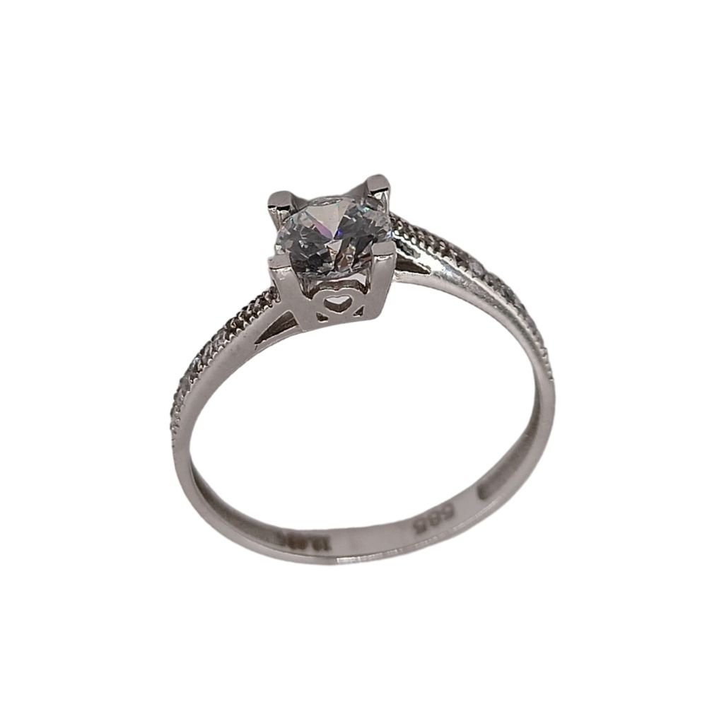 Κομψό δαχτυλίδι από λευκόχρυσο 14 καρατίων, διακοσμημένο με λαμπερό ζιργκόν σε κεντρική θέση και λεπτομέρειες ζιργκόν κατά μήκος του στελέχους. Ιδανικό για καθημερινή κομψότητα ή ως δώρο αγάπης.