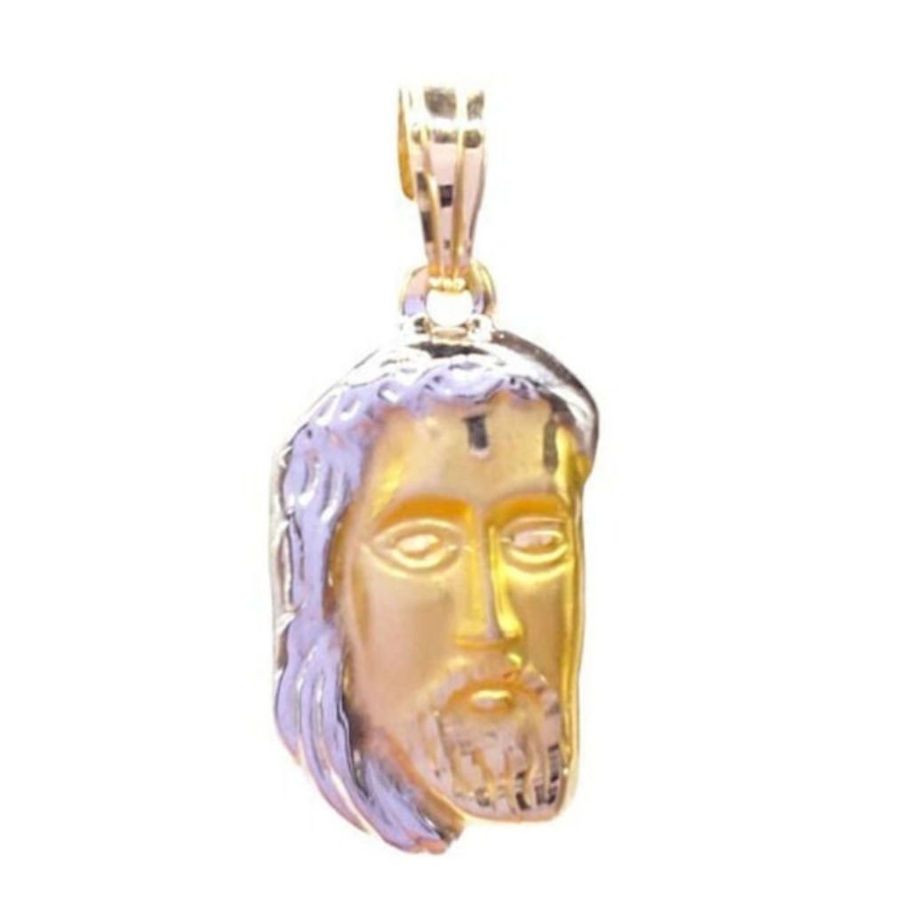 Φυλαχτό μασίφ μενταγιόν κεφαλή του Χριστού από χρυσό και λευκόχρυσο 14 καρατίων. Τα χαρακτηριστικά του προσώπου είναι ανάγλυφα με λουστρέ και ματ φινιρίσματα.