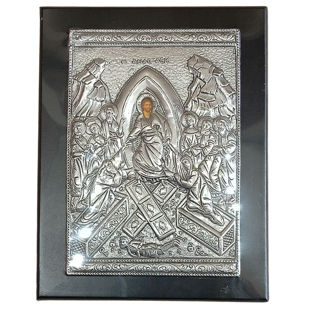 Πανέμορφη εικόνα της Ανάστασης του Κυρίου, με ανάγλυφη μεταλλική απεικόνιση σε ασημί απόχρωση και χρυσαφένες λεπτομέρειες στο φωτοστέφανο του Χριστού. Η σύνθεση αποδίδει με ιεροπρέπεια τη στιγμή της νίκης κατά του θανάτου.