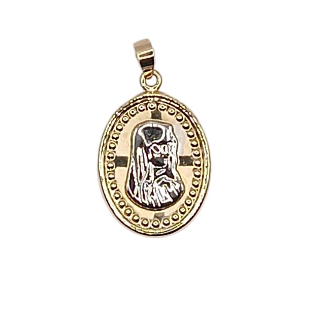 Κομψό φυλαχτό σε οβάλ σχήμα από χρυσό 14 καρατίων, με ανάγλυφη παράσταση της Παναγίας σε λευκό χρυσό, πλαισιωμένη από διακριτικό διάτρητο σχέδιο. Ο συνδυασμός δίχρωμου χρυσού και ο περίτεχνος διάκοσμος το καθιστούν ένα εντυπωσιακό κόσμημα, γεμάτο συμβολισμό αγάπης και προστασίας, ιδανικό για καθημερινή χρήση ή ως δώρο πίστης.