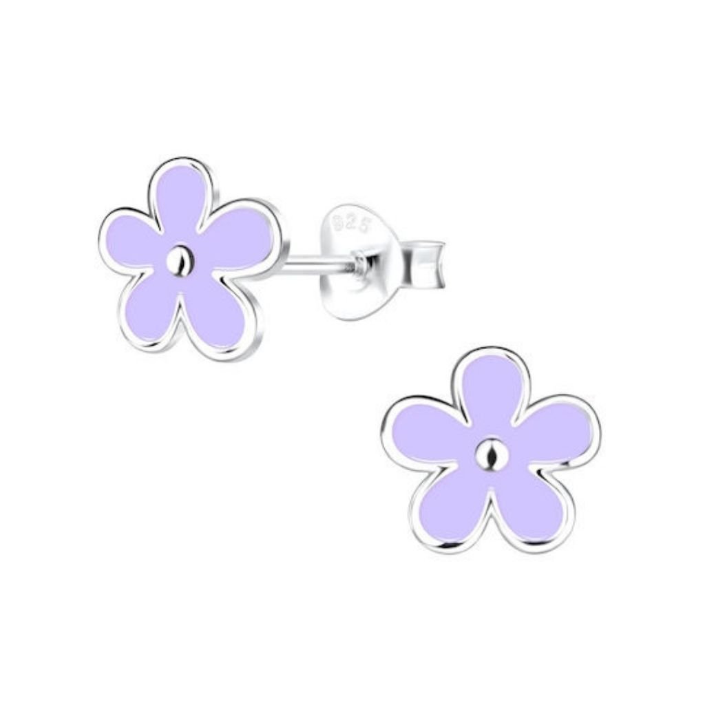Παιδικά καρφωτά σκουλαρίκια Bellita σε σχέδιο μοβ λουλουδιού με πέντε πέταλα και γυαλιστερό μεταλλικό κέντρο. Φτιαγμένα από ασήμι 925, είναι υποαλλεργικά, ελαφριά και άνετα για καθημερινή χρήση. Το κούμπωμα τύπου πεταλούδας προσφέρει σταθερότητα και ασφάλεια.