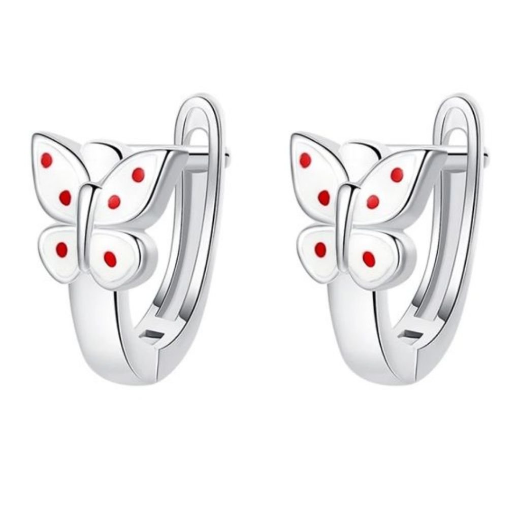 Παιδικά σκουλαρίκια Bellita με ιδιαίτερο ανάγλυφο σχέδιο πεταλούδας, διακοσμημένα με λευκό σμάλτο και ζωντανές κόκκινες βούλες. Κατασκευασμένα από ασήμι 925, είναι υποαλλεργικά και ασφαλή για την καθημερινή χρήση. Το κούμπωμα τύπου κλιπ εξασφαλίζει άνετη και σταθερή εφαρμογή.