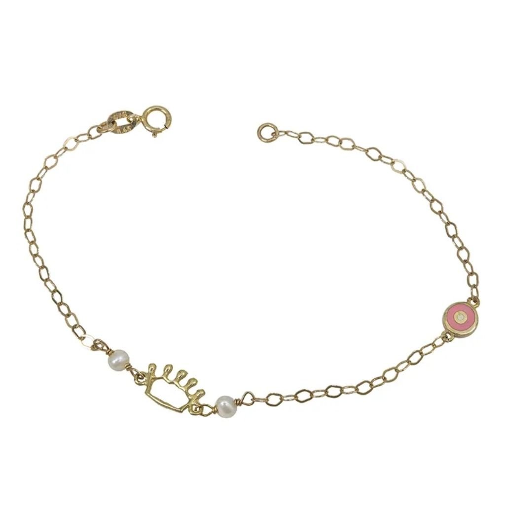 Παιδικό βραχιόλι από χρυσό 14 καρατίων, σε λουστρέ φινίρισμα, με μοτίφ κορωνίτσα στολισμένη με δυο μικρά μαργαριτάρια και ένα ματάκι από ροζ σμάλτο. Στολίστε τη μικρή σας πριγκίπισσα με αυτό το όμορφο βραχιόλι!