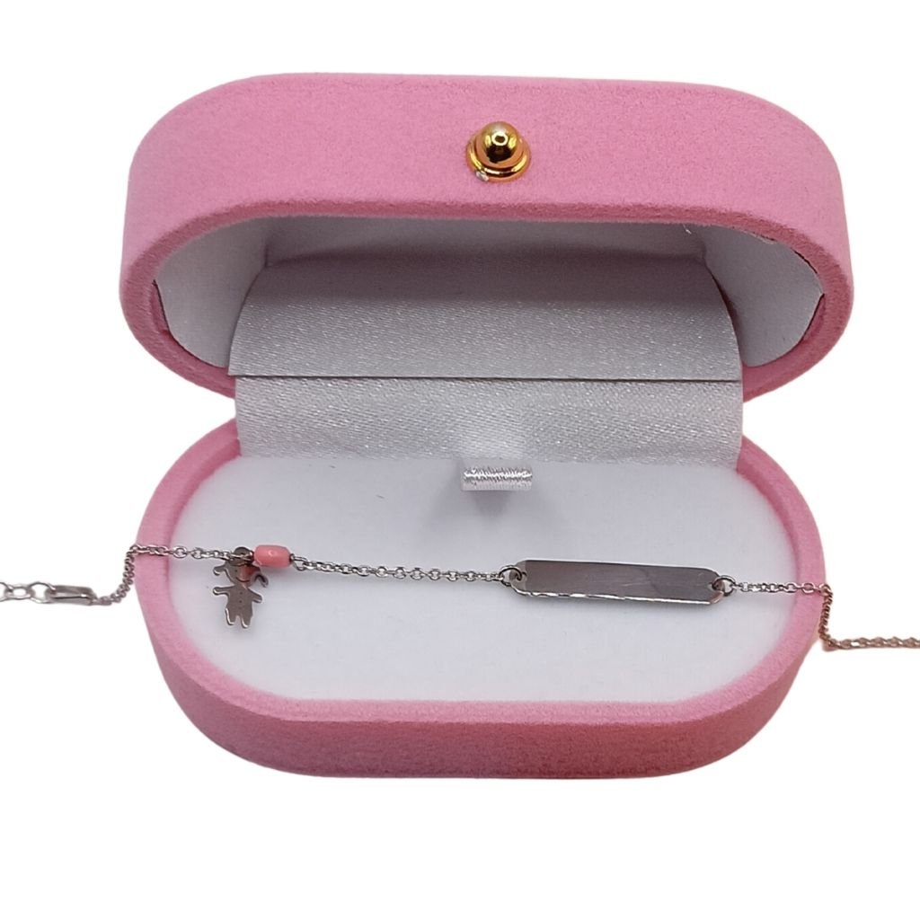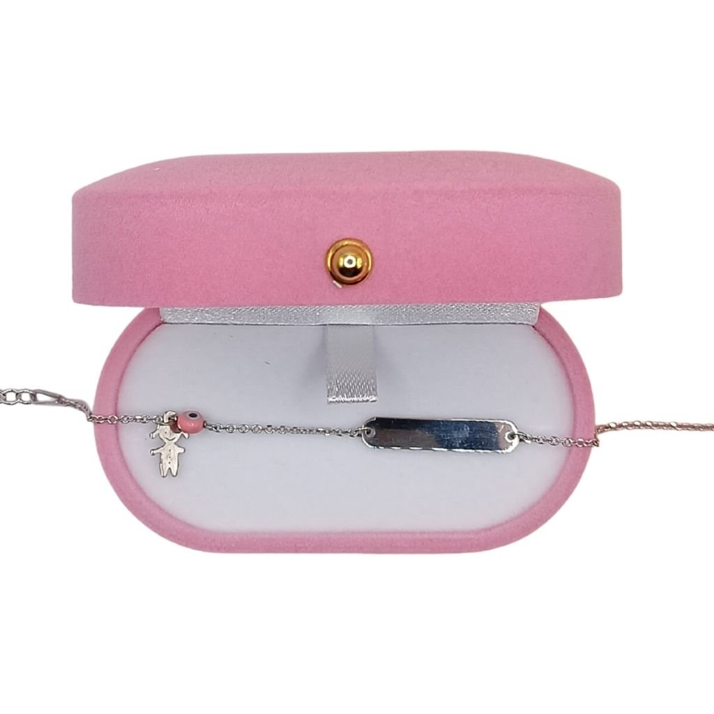 Λεπτό και κομψό παιδικό βραχιόλι από ασήμι 925, με πλακέτα κατάλληλη για χάραξη ονόματος ή ημερομηνίας. Διαθέτει διακοσμητικό κοριτσάκι και ροζ χαντρούλα, χαρίζοντας παιχνιδιάρικο και τρυφερό ύφος. Ιδανικό δώρο για γέννηση, βάπτιση ή γενέθλια.