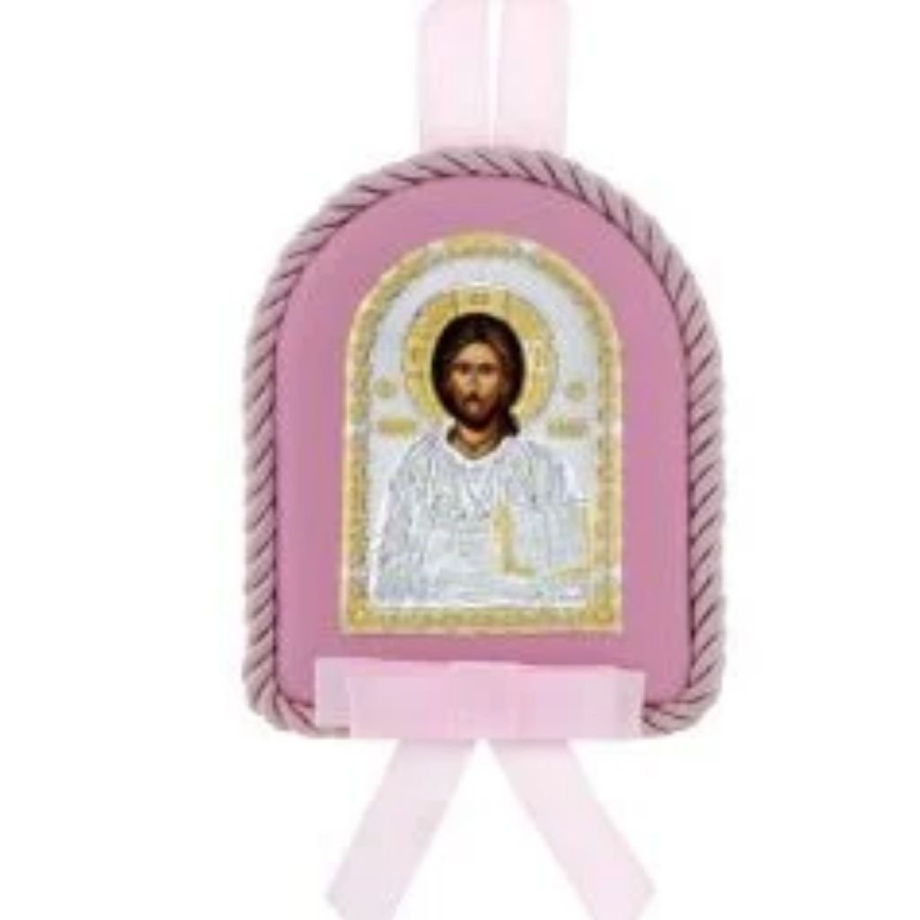 Γλυκό παιδικό εικόνισμα με την παράσταση του Χριστού, διακοσμημένο με ασήμι 925 και χρυσές λεπτομέρειες. Σε ροζ φόντο με περιμετρικό κορδόνι και ροζ κορδέλα, αποτελεί ιδανικό δώρο βάπτισης ή γεννήσεως για κοριτσάκι.