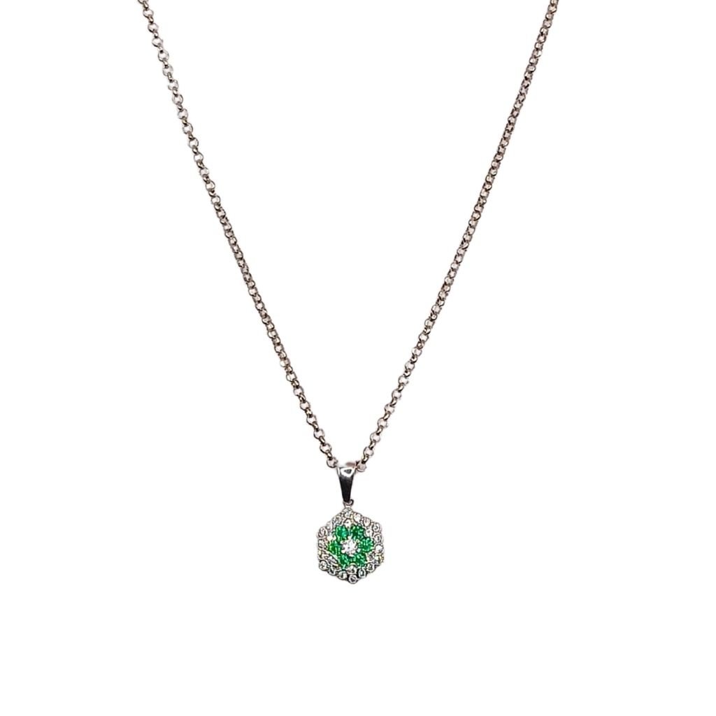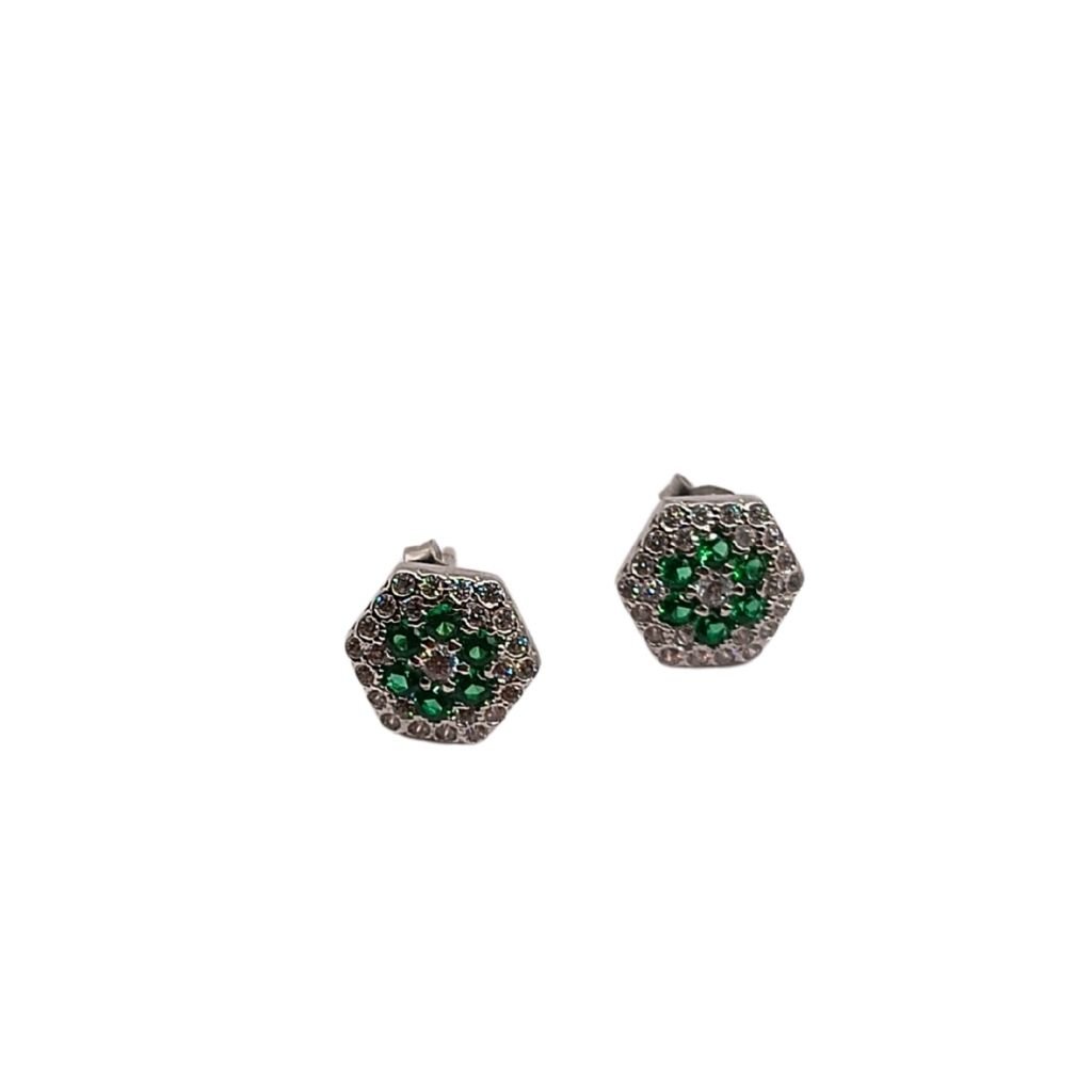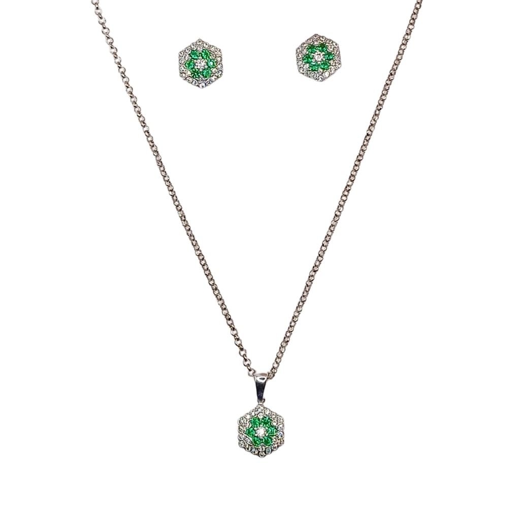 Κομψό και φωτεινό σετ από ασήμι 925 με μενταγιόν και σκουλαρίκια σε εξάγωνο σχήμα, διακοσμημένα με πράσινο ζιργκόν και λευκές πέτρες.