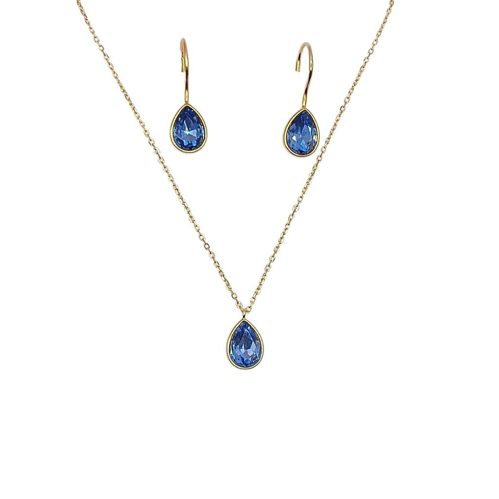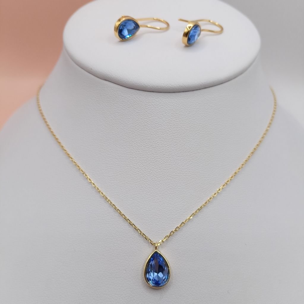 Κομψό σετ με επίχρυση αλυσίδα και σκουλαρίκια, διακοσμημένα με γαλάζιο ζιργκόν σε σχήμα σταγόνας.
