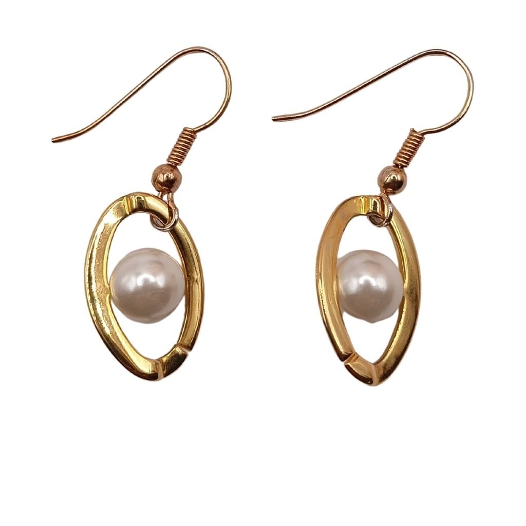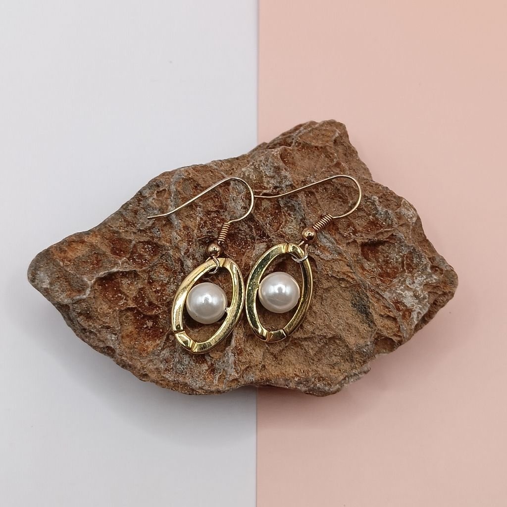 Κομψά σκουλαρίκια από ανοξείδωτο ατσάλι σε χρυσό, με μοντέρνους οβάλ κρίκους που αγκαλιάζουν μια λευκή πέρλα.