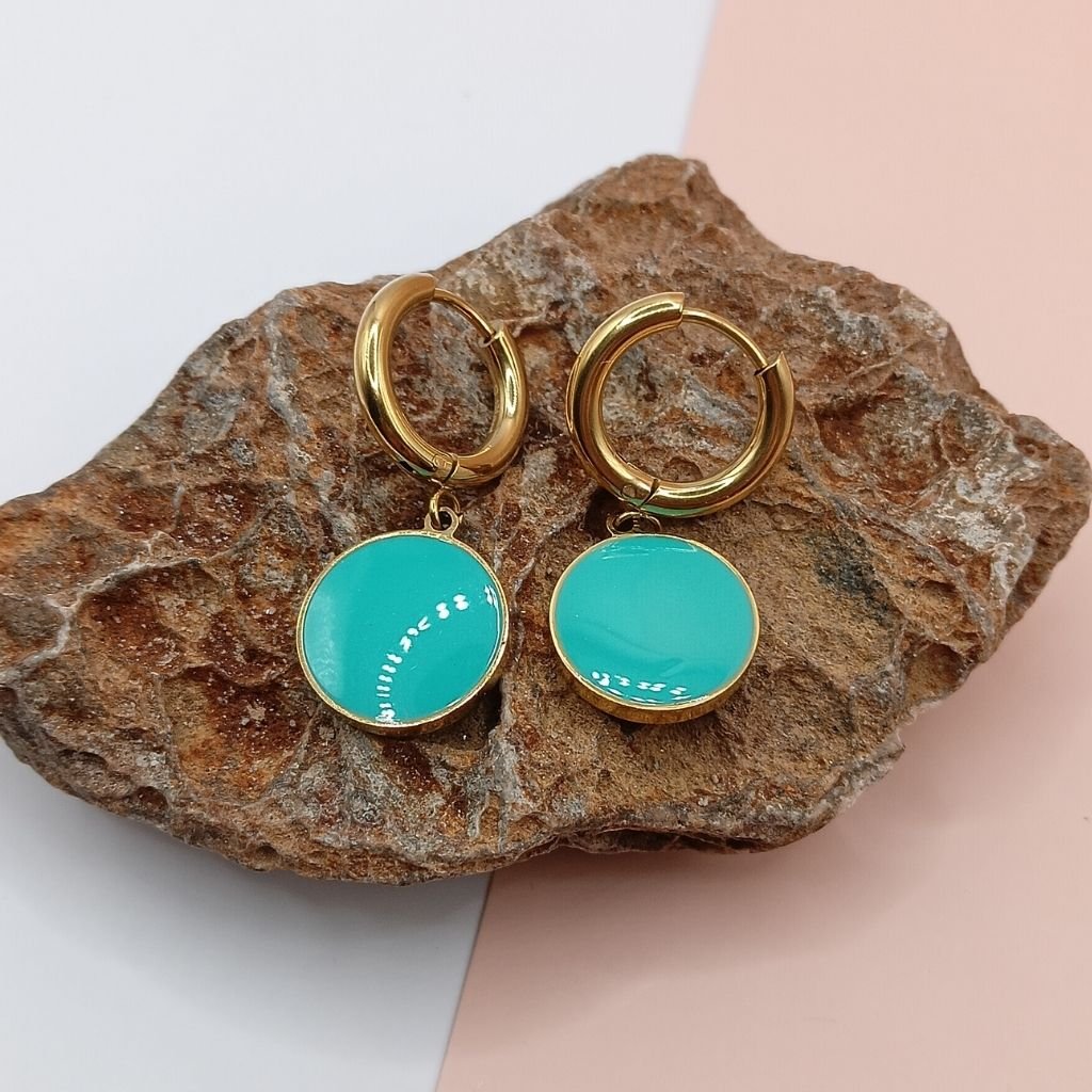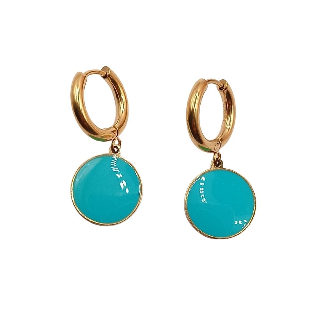 Μοντέρνα σκουλαρίκια από ανοξείδωτο ατσάλι σε χρυσό με μικρούς κρίκους που καταλήγουν σε στρογγυλό στοιχείο με τιρκουάζ σμάλτο.