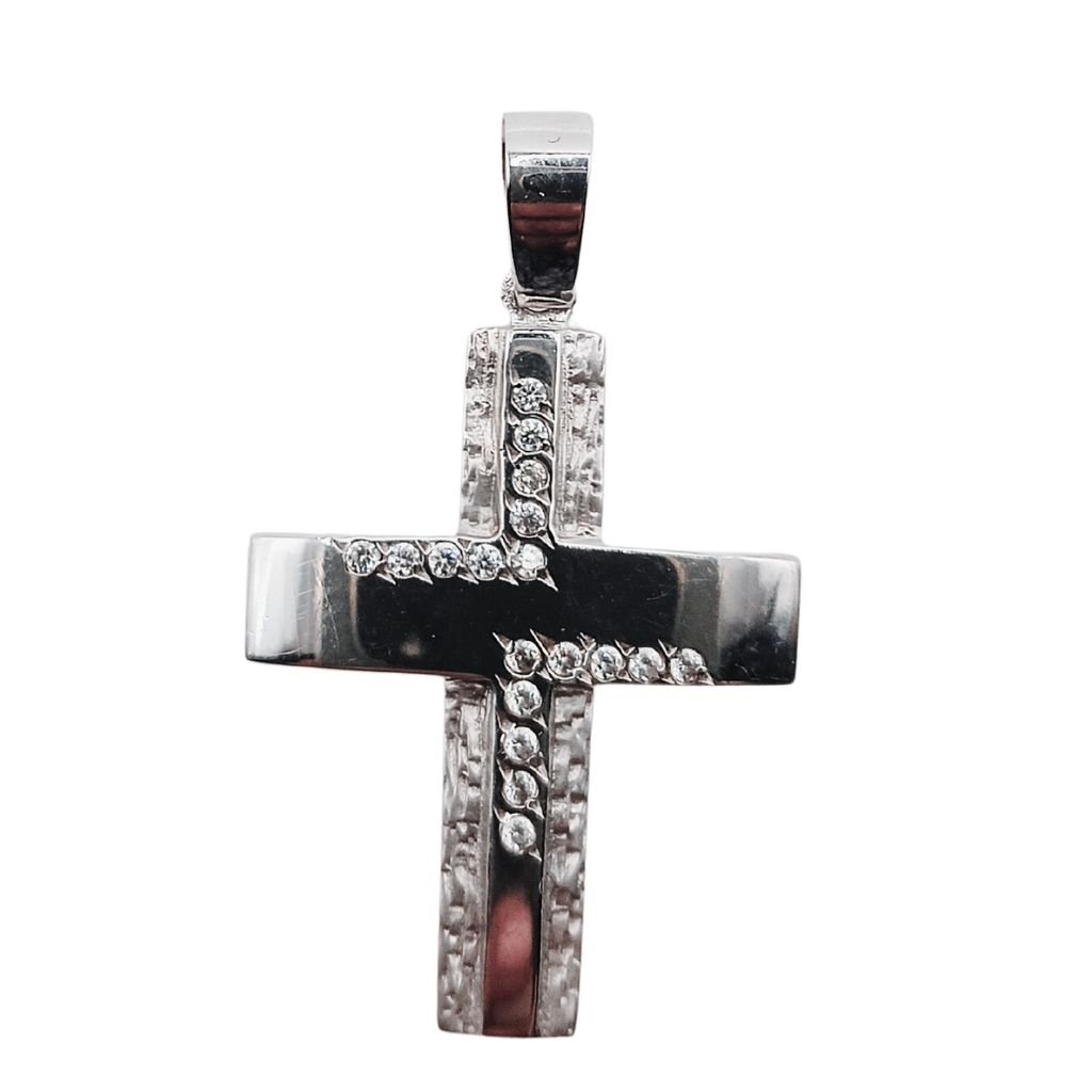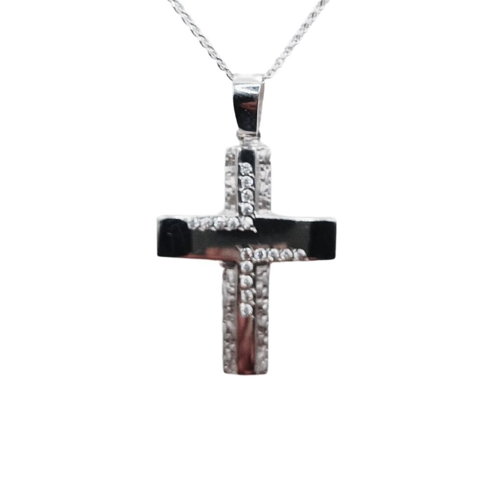 Λαμπερός σταυρός σε λευκόχρυσο 14 καρατίων, διακοσμημένος με δύο σειρές από αστραφτερά ζιργκόν κατά μήκος του σταυρού, που προσθέτουν μοναδική λάμψη και κομψότητα. Ένα διαχρονικό κόσμημα που μαγνητίζει τα βλέμματα.