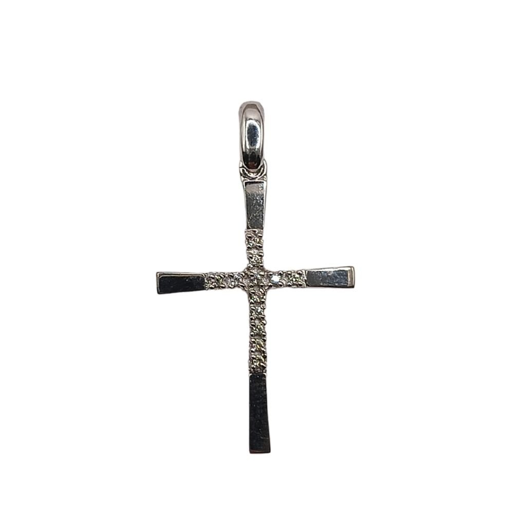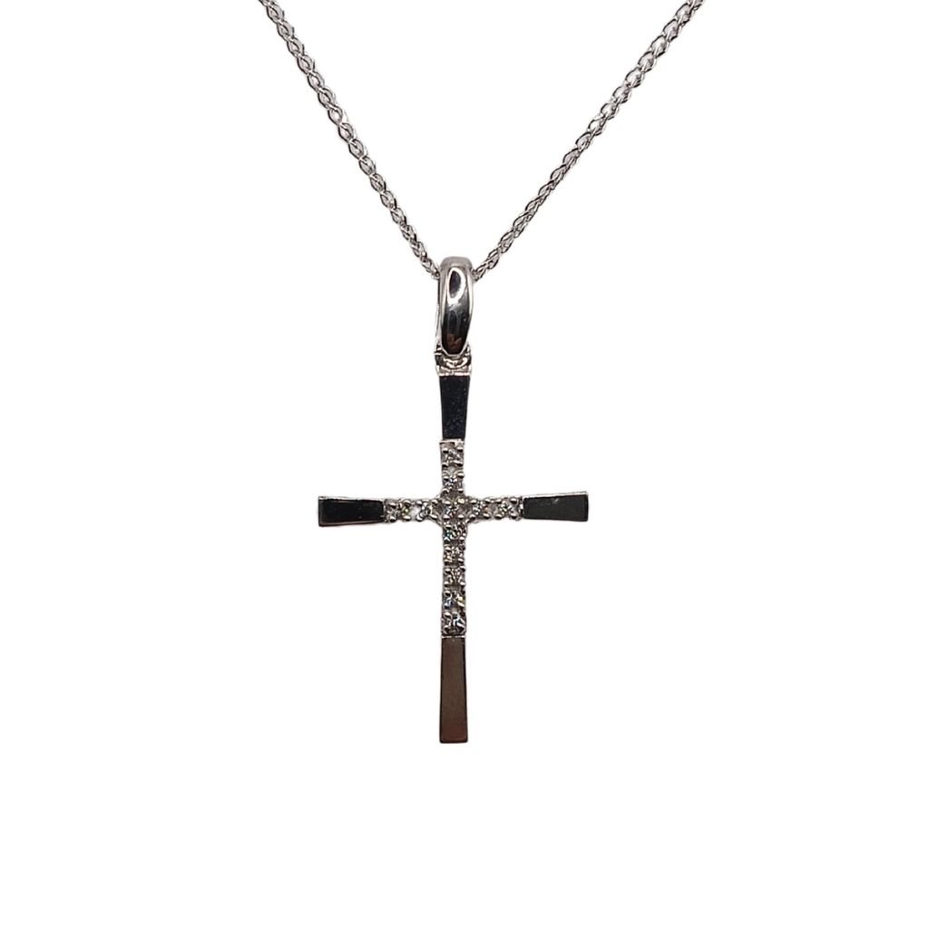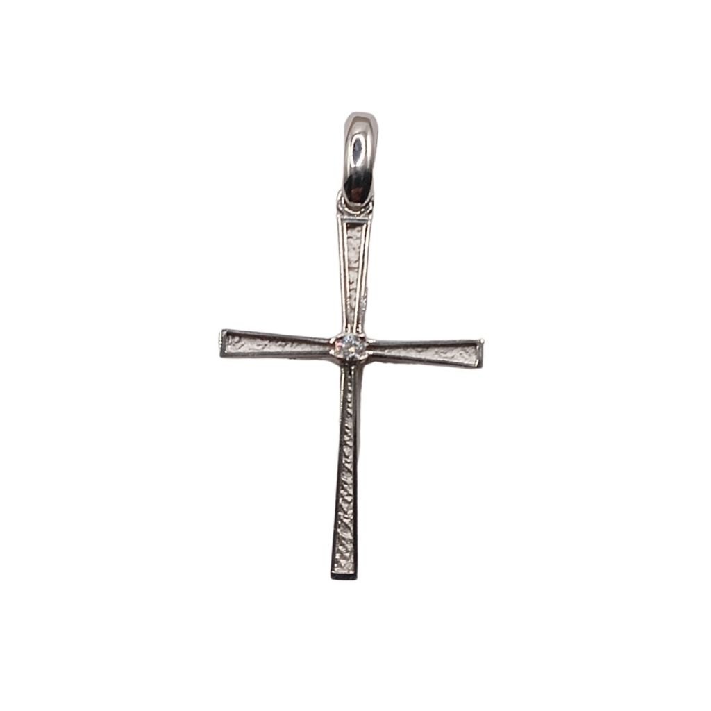 Κομψός σταυρός λευκόχρυσος 14 καρατίων, διπλής όψης. Μία πλευρά διακοσμημένη με λαμπερά ζιργκόν σε σταυροειδή διάταξη και η άλλη με ανάγλυφο σχέδιο. Ιδανικός για όσους αγαπούν τη διακριτική πολυτέλεια.