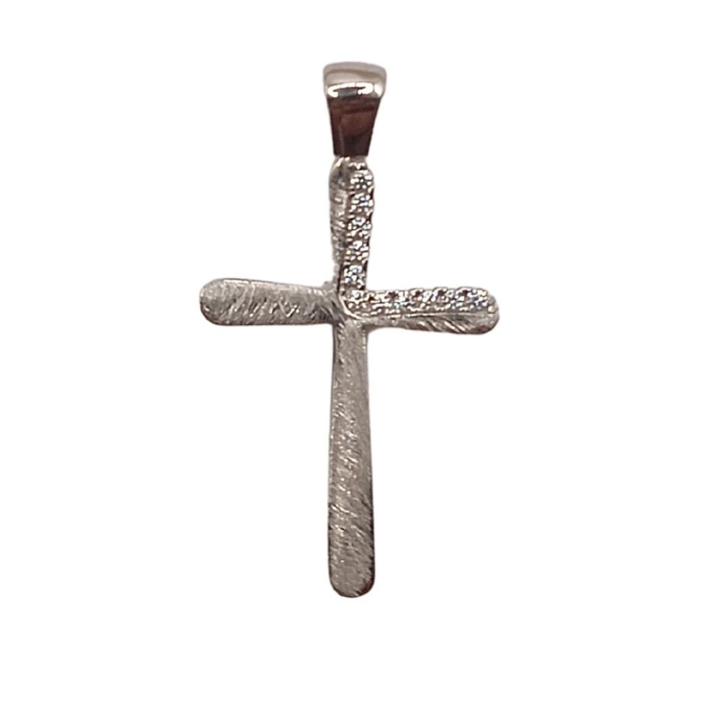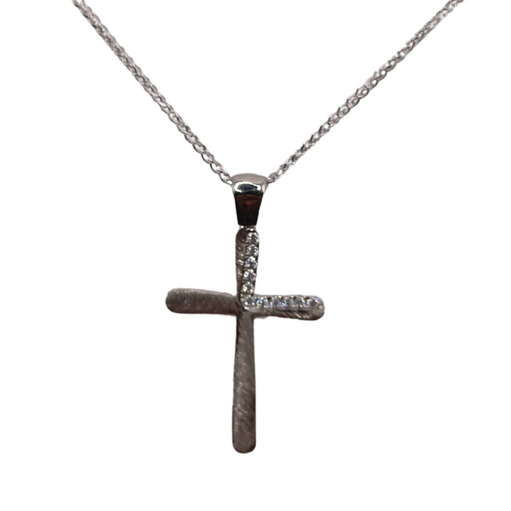 Μοντέρνος σταυρός σε λευκόχρυσο 14 καρατίων, με ματ φινίρισμα και λαμπερά ζιργκόν που κοσμούν το κάθετο και οριζόντιο σκέλος. Ιδανικός για διακριτική αλλά ιδιαίτερη εμφάνιση.
