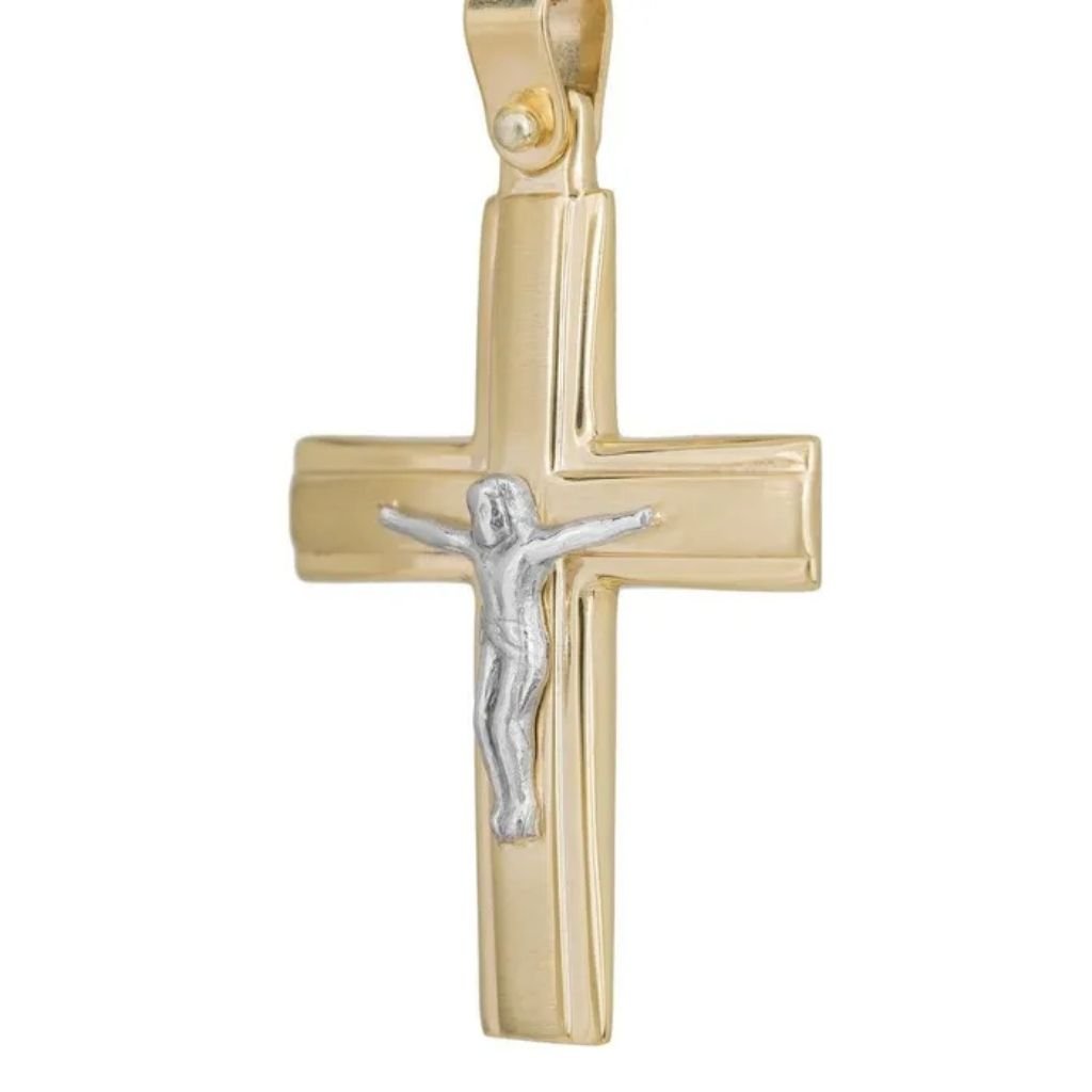 Κλασικός σταυρός σε χρυσό 9 καρατίων με λευκόχρυσο Εσταυρωμένο στο κέντρο. Ένα παραδοσιακό σχέδιο που συνδυάζει δύο τόνους μετάλλου, ιδανικό για όσους θέλουν κάτι διαχρονικό και συμβολικό.