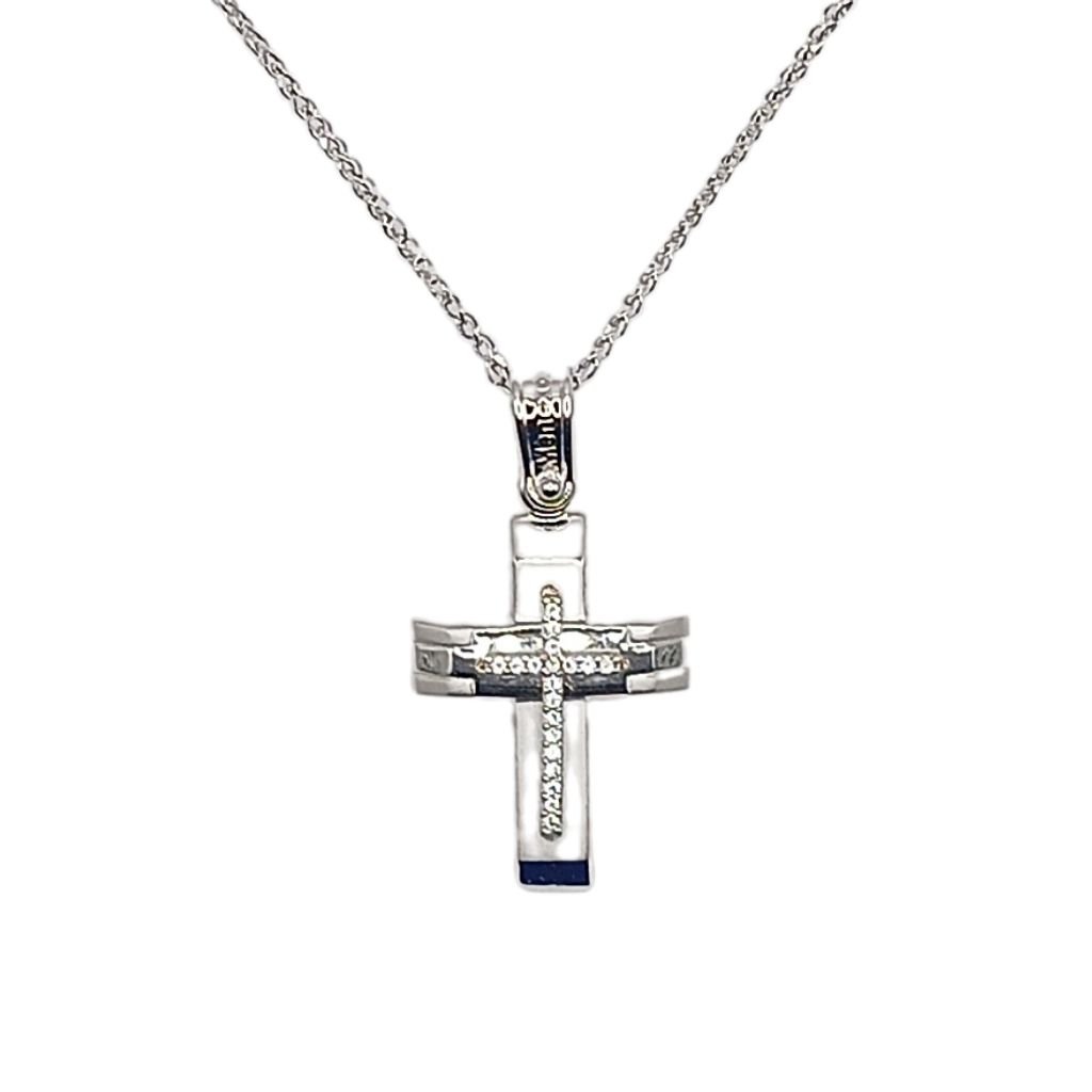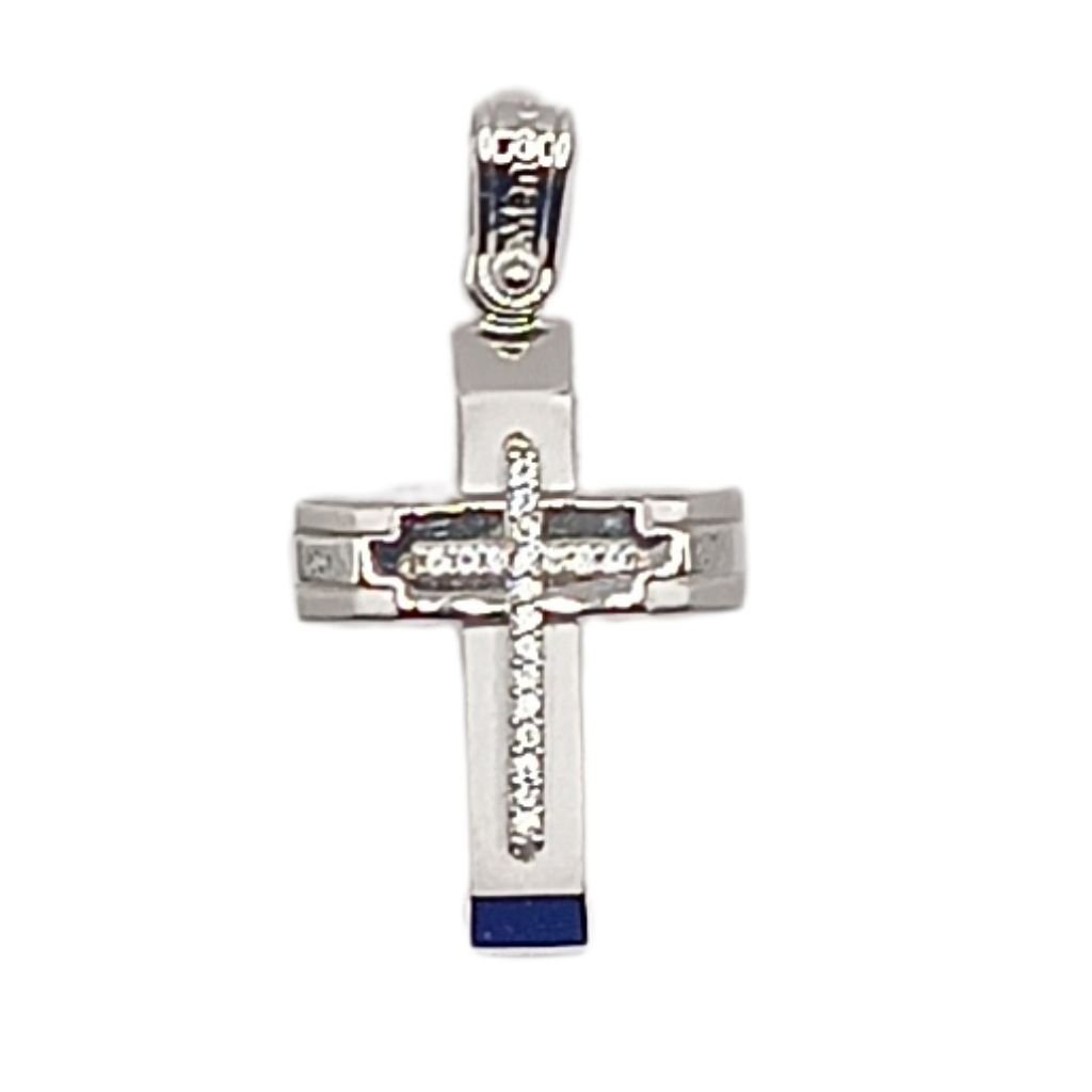 Εντυπωσιακός σταυρός από λευκό χρυσό 14Κ, διακοσμημένος με λαμπερά ζιργκόν που χαρίζουν εκλεπτυσμένη λάμψη. Ένα κομψό κόσμημα που συνδυάζει διαχρονικότητα και πολυτέλεια, ιδανικό για κάθε σημαντική στιγμή αλλά και για καθημερινό στυλ.