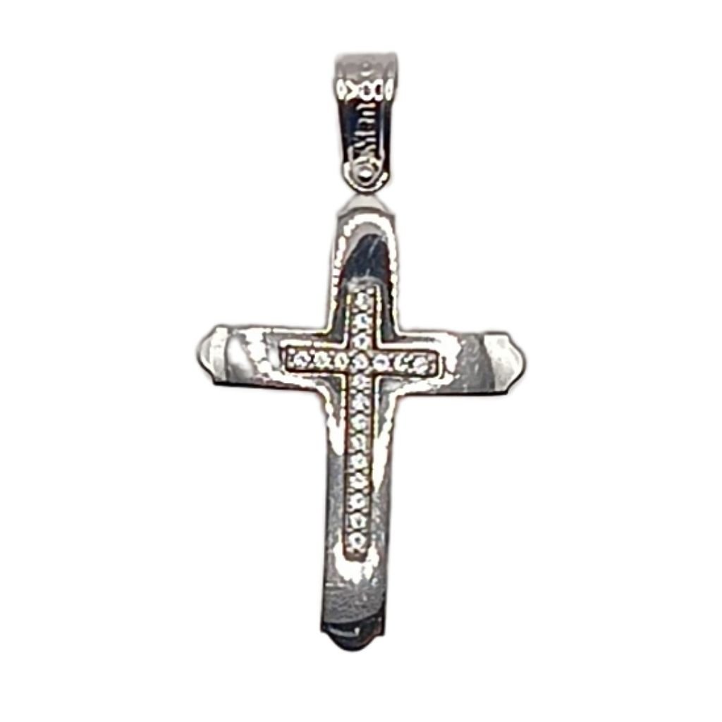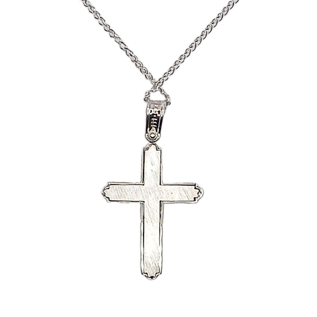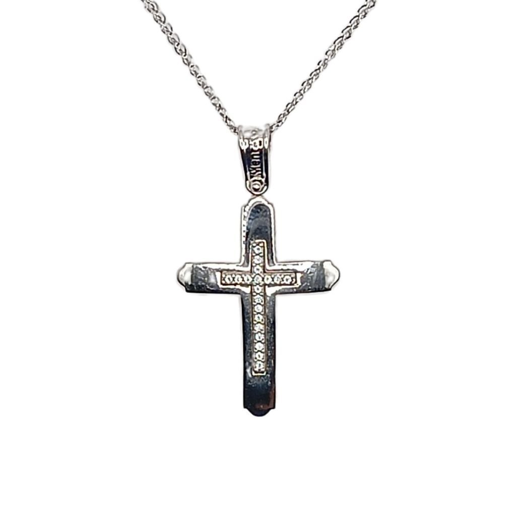 Εντυπωσιακός σταυρός από λευκόχρυσο 14 καρατίων, διπλής όψης, με ματ φινίρισμα από τη μία πλευρά και λαμπερά ζιργκόν από την άλλη. Ένα ιδιαίτερο κόσμημα που σου επιτρέπει να το φοράς με δύο διαφορετικούς τρόπους, ανάλογα με τη διάθεση και το στυλ σου.