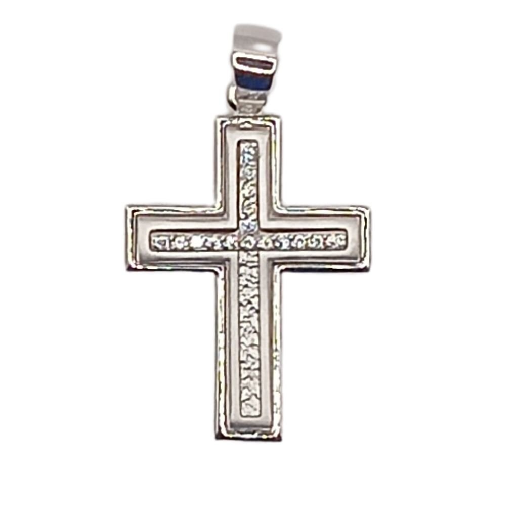 Εντυπωσιακός σταυρός από λευκόχρυσο 14 καρατίων, διακοσμημένος με λαμπερά ζιργκόν που σχηματίζουν έναν σταυρό στο κέντρο, προσδίδοντας λάμψη και ιδιαίτερο στυλ.