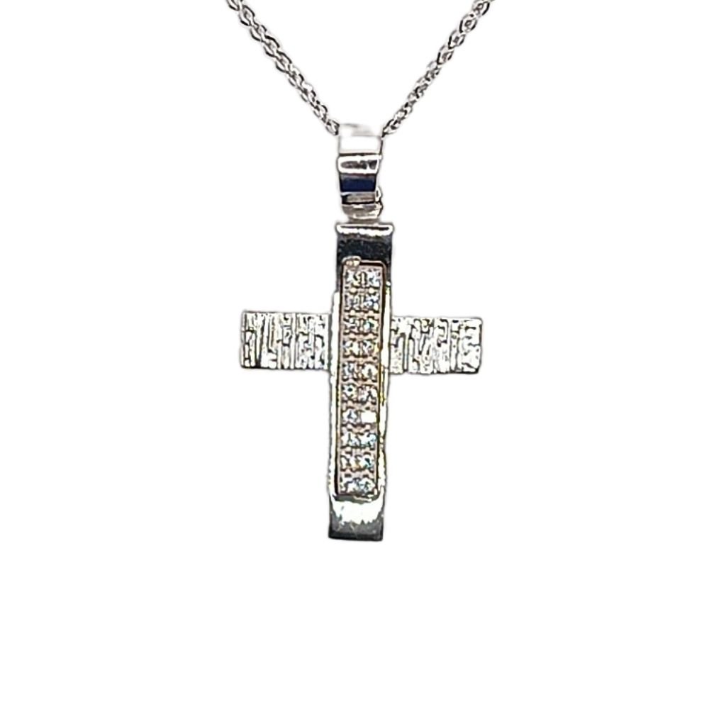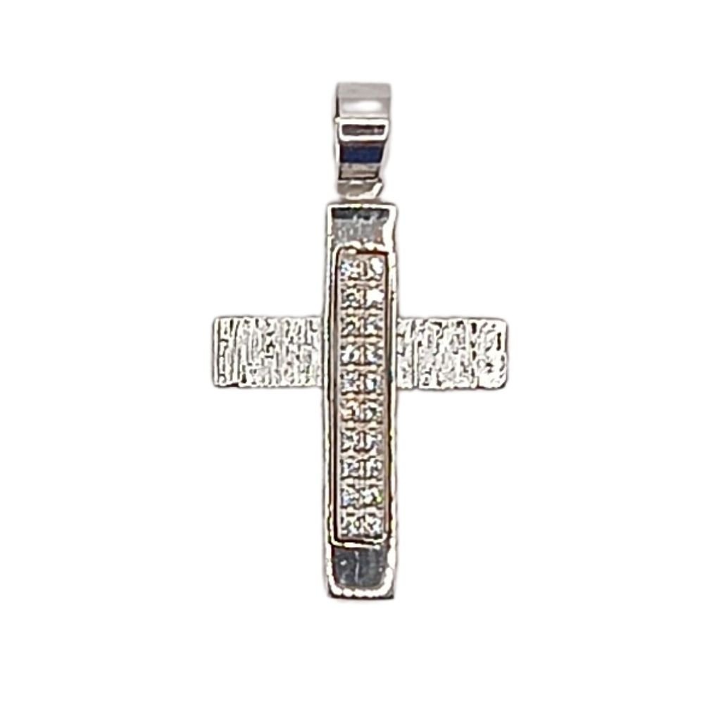 Σταυρός από λευκόχρυσο 14 καρατίων με εντυπωσιακή κάθετη γραμμή από ζιργκόν που προσθέτει κομψότητα και λάμψη. Το μοντέρνο ανάγλυφο φινίρισμα τον καθιστά ιδανικό για κάθε στυλ, ενώ το βάρος του στα 2,7 γραμμάρια τον καθιστά στιβαρό και ταυτόχρονα κομψό.