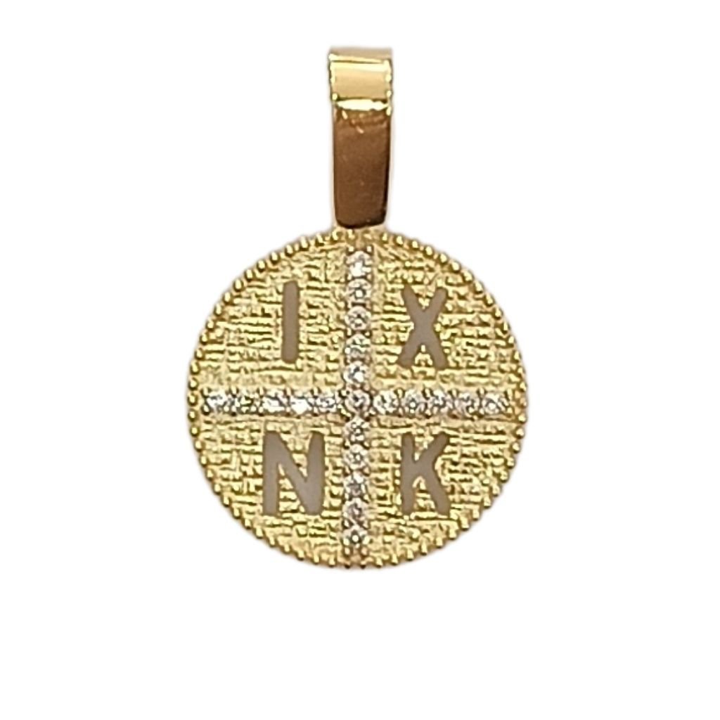 Στρογγυλό φυλαχτό με θρησκευτικό σύμβολο IXNK, διακοσμημένο με λευκά ζιργκόν που σχηματίζουν σταυρό.