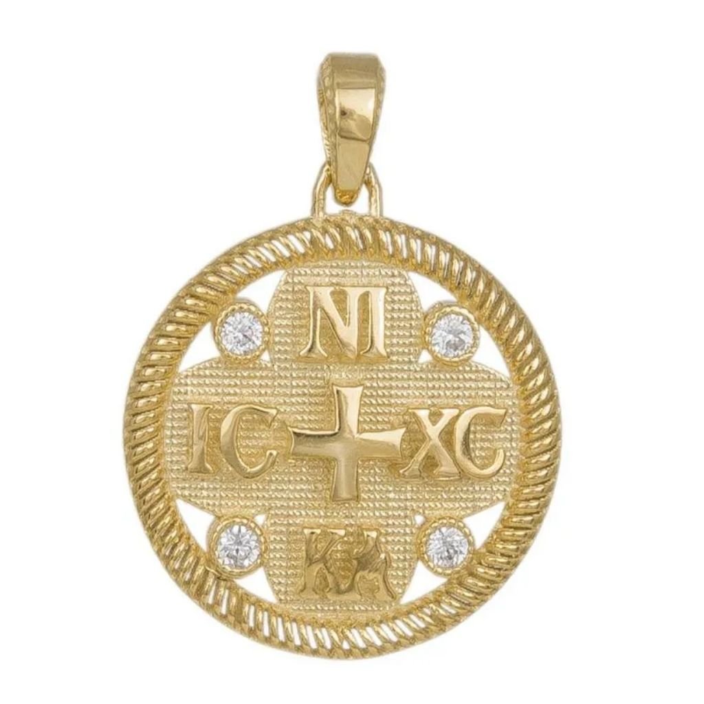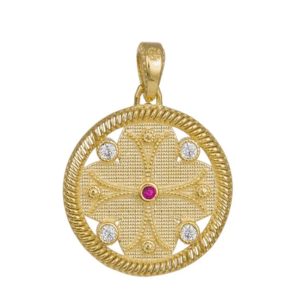 Γυναικείο κρεμαστό φυλαχτό διπλής όψης από χρυσό 9 καρατίων ,με ανάγλυφο σχεδιασμό διακοσμημένο με λευκά και κόκκινο ζιργκόν. Συνδυάστε το με αλυσίδα ή παραμάνα της επιλογής σας και χαρίστε ένα μοναδικό δώρο στο βαφτιστήρι σας!