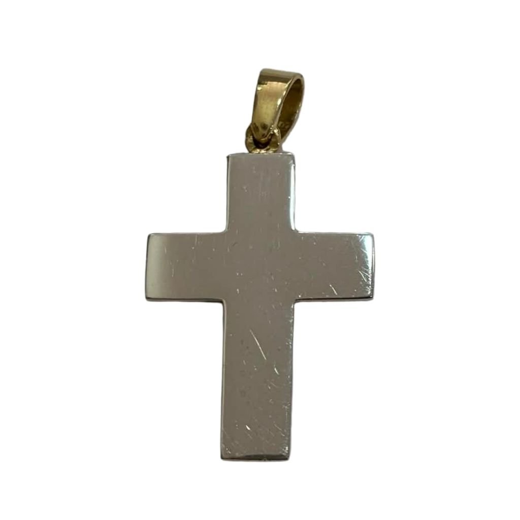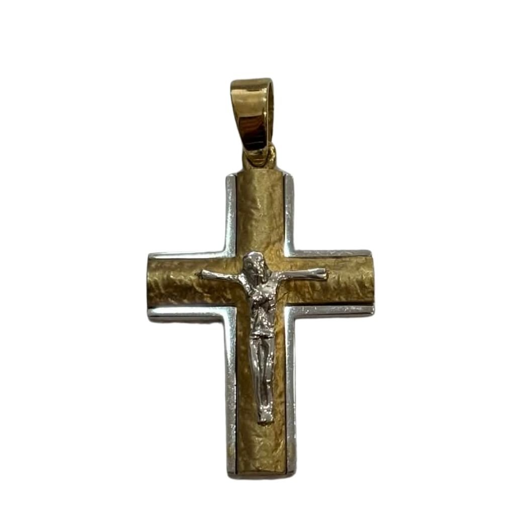 Εντυπωσιακός και διαχρονικός δίχρωμος σταυρός από χρυσό 14 καρατίων, με κομψό συνδυασμό κίτρινου και λευκού χρυσού. Στο κέντρο δεσπόζει ο Εσταυρωμένος, προσδίδοντας ιδιαίτερο συμβολισμό και πνευματική αξία στο κόσμημα.