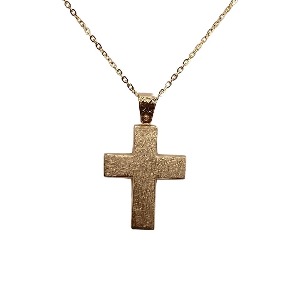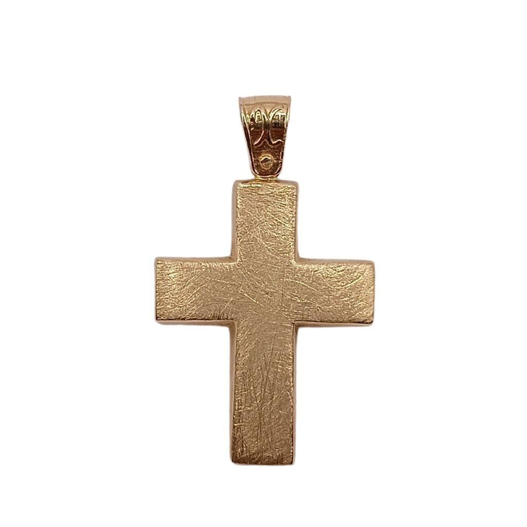 Σταυρός από χρυσό 14 καρατίων, με εντυπωσιακό ματ σαγρέ φινίρισμα που προσδίδει ένα διακριτικό αλλά ξεχωριστό στυλ.