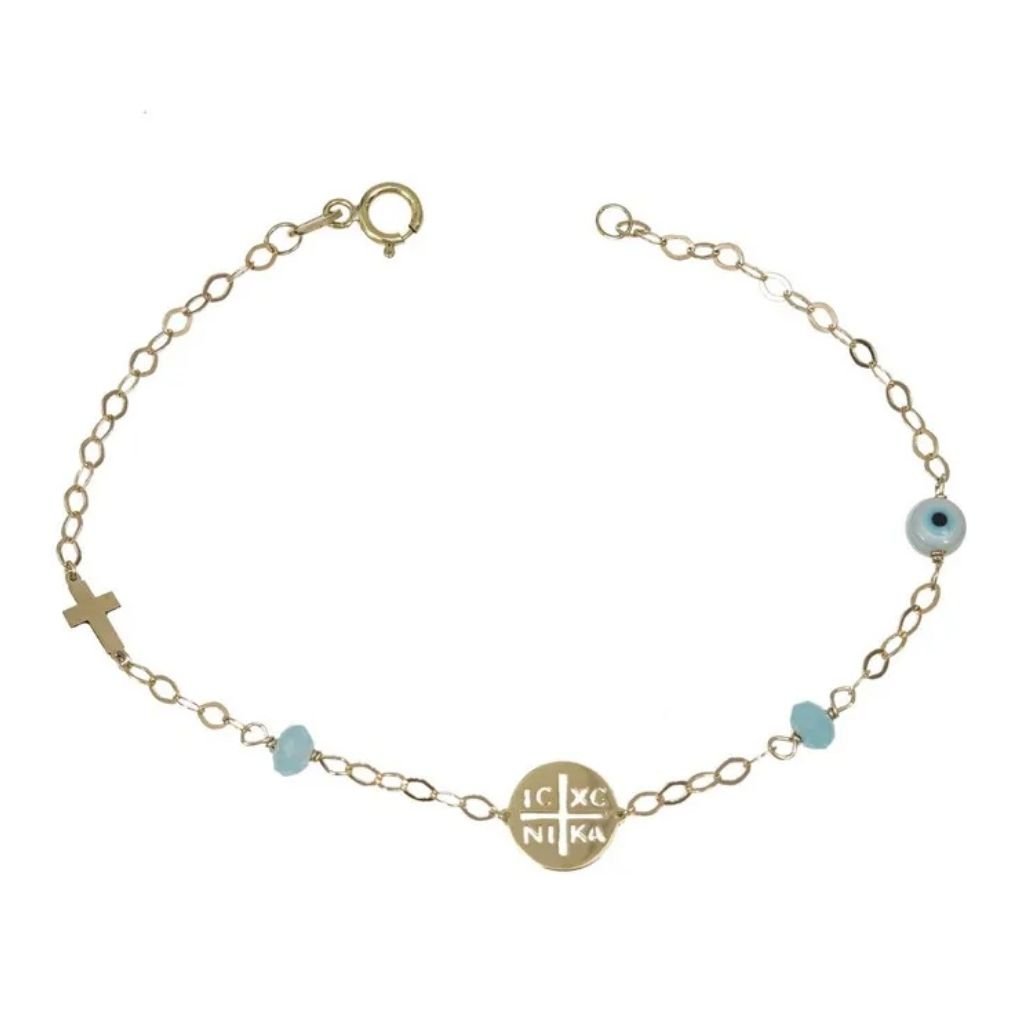 Υπέροχο χρυσό βραχιόλι για αγοράκι 9 καρατίων, διακοσμημένο με ένα λουστρέ διάτρητο Κωνσταντινάτο, ένα σταυρουδάκι, ματάκι φίλντισι και μπλε χαντρούλες!