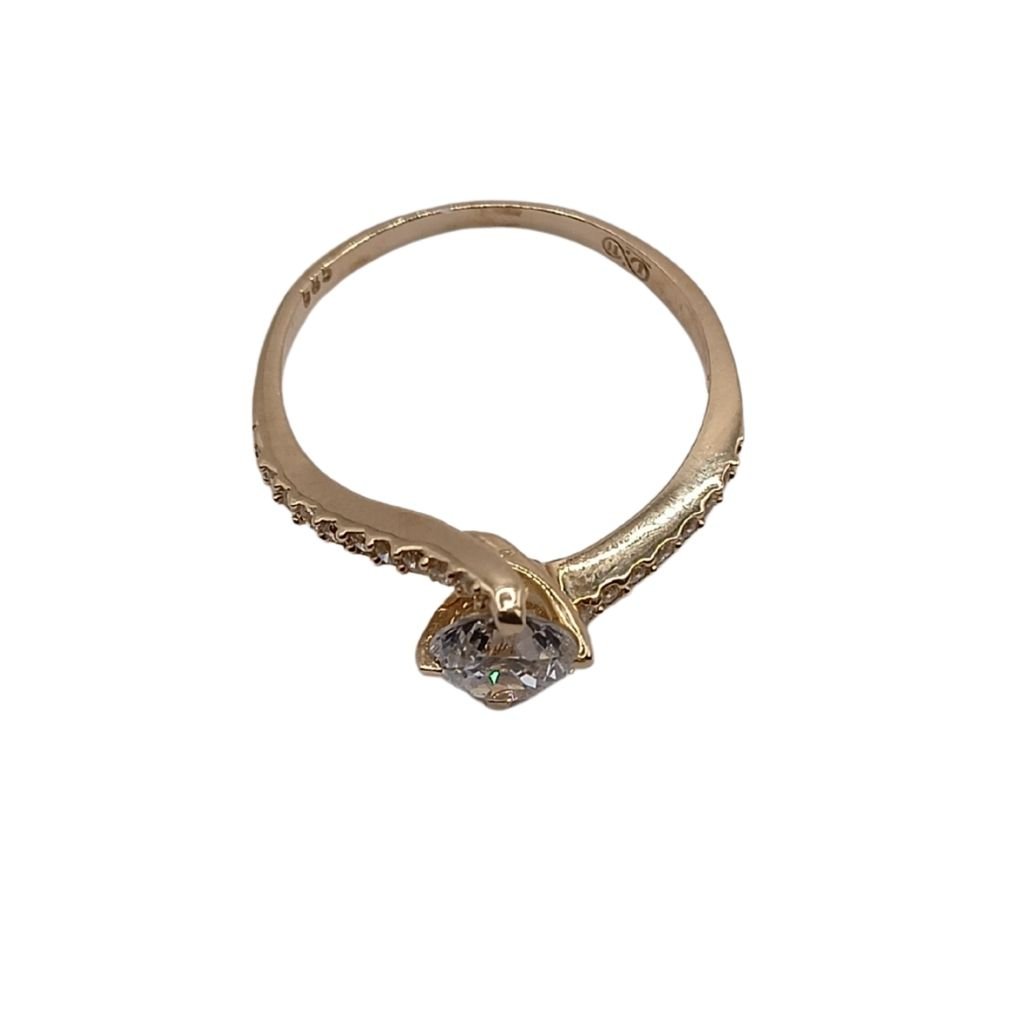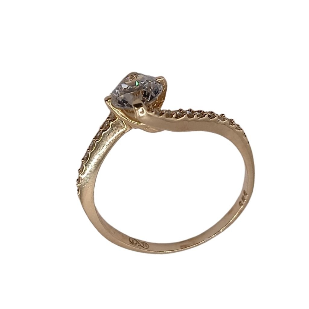 Κομψό δαχτυλίδι από χρυσό 14 καρατίων σε κίτρινο χρώμα, διακοσμημένο με λαμπερό κεντρικό ζιργκόν σε καστόνι και μικρά ζιργκόν κατά μήκος του δαχτυλιδιού. Ιδανικό για κομψές εμφανίσεις, αρραβώνα ή δώρο με διακριτική πολυτέλεια.