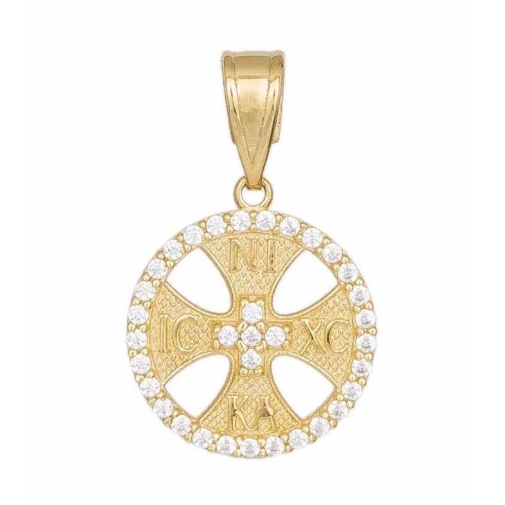 Γυναικείο διάτρητο Κωσταντινάτο κατασκευασμένο από χρυσό 9 καρατίων. Μοναδικό φυλαχτό στολισμένο με λευκές πέτρες ζιργκόν, με ματ επεξεργασία και υπέροχες ανάγλυφες λεπτομέρειες. Συνδυάστε το με μια χρυσή αλυσίδα της αρεσκείας σας και χαρίστε στην αγαπημένη σας ένα διαχρονικό δώρο!