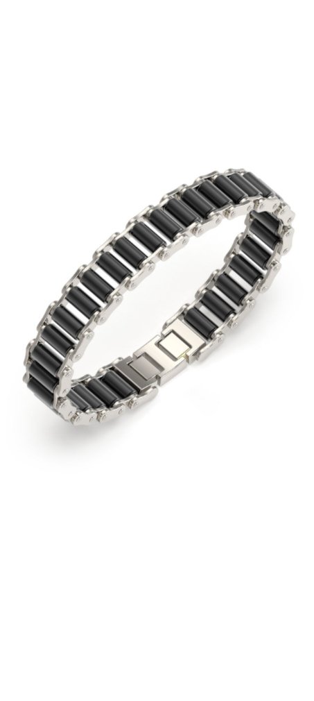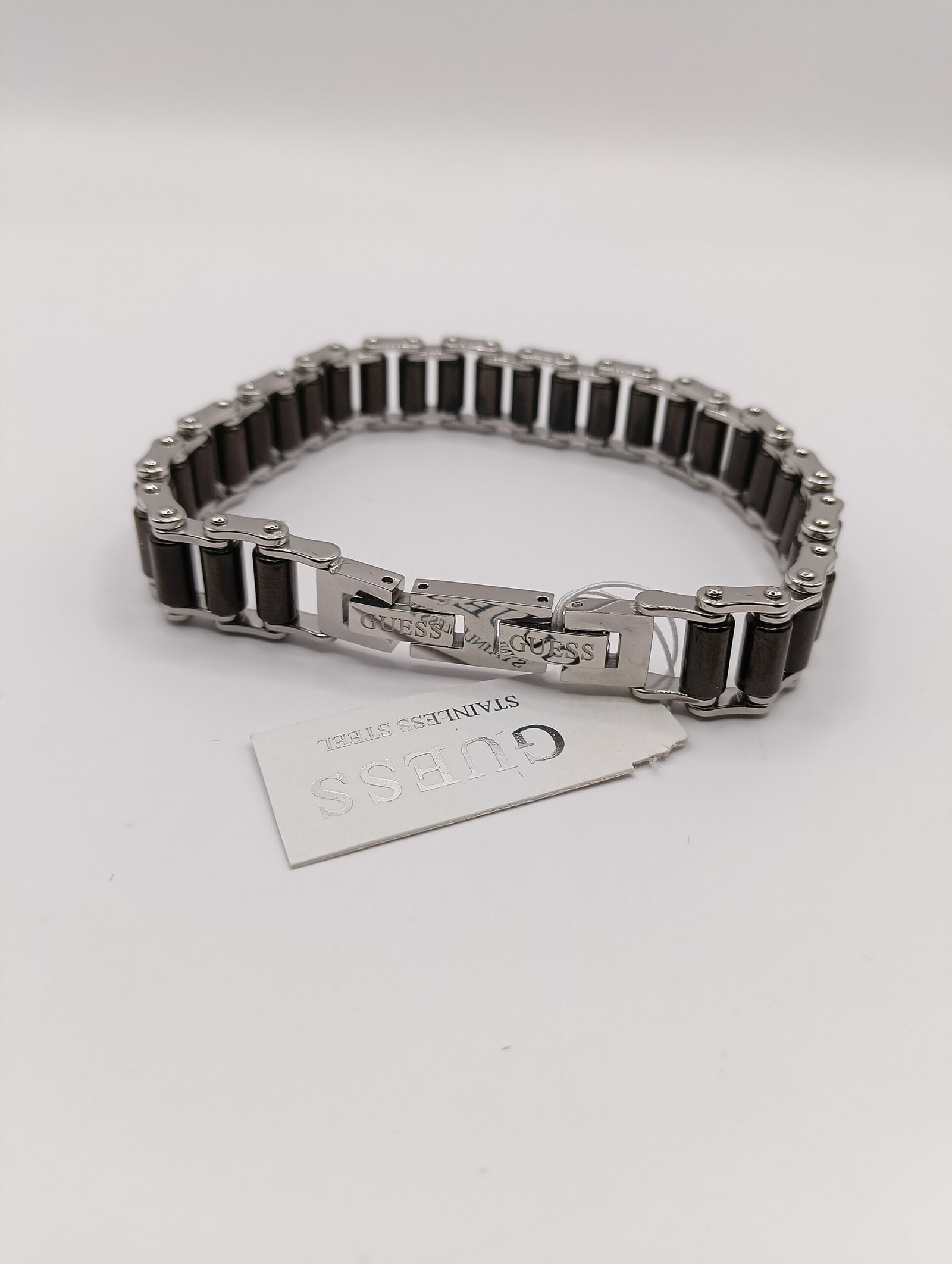 Ανδρικό βραχιόλι Guess από ανοξείδωτο ατσάλι σε στιλ αλυσίδας μηχανής, με μαύρα ενθέματα που του δίνουν μια πιο μοντέρνα, “tech” αισθητική. Κλείσιμο ασφαλείας με λογότυπο GUESS χαραγμένο.