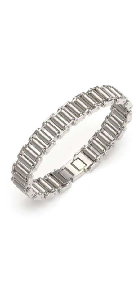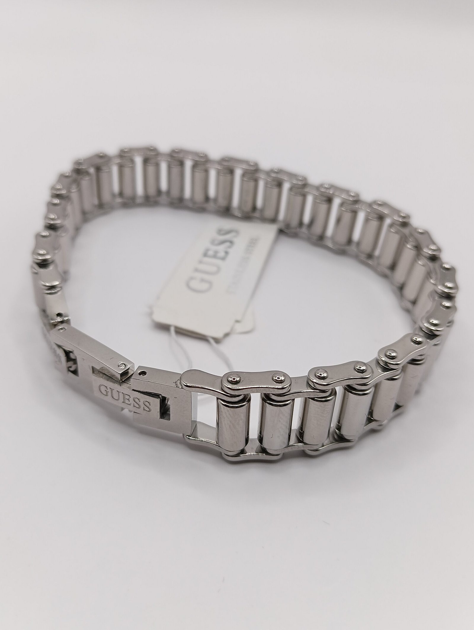 Ανδρικό βραχιόλι Guess σε industrial σχεδιασμό, εμπνευσμένο από ρολό αλυσίδας μηχανής. Κατασκευασμένο από ανοξείδωτο ατσάλι υψηλής ποιότητας, με στιβαρό κούμπωμα και χαραγμένο λογότυπο GUESS.
