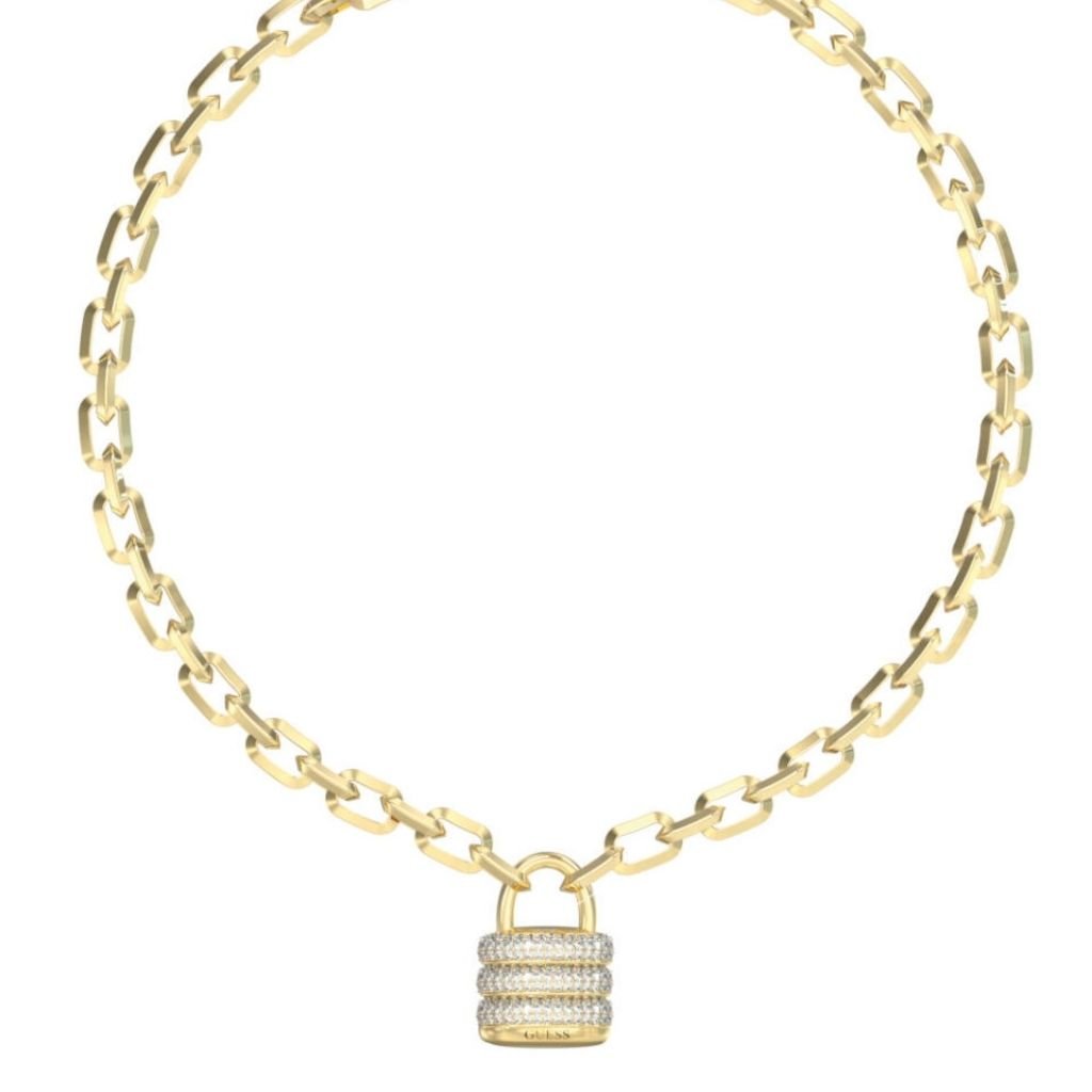 Μοντέρνο κολιέ Guess με εντυπωσιακό μενταγιόν σε σχήμα λουκέτου, διακοσμημένο με λαμπερούς λευκούς κρυστάλλους. Η αλυσίδα από ανοξείδωτο ατσάλι με χρυσό φινίρισμα δίνει πολυτελή όψη και κάνει το κόσμημα ιδανικό για να ολοκληρώσει κάθε εμφάνιση. Ένα statement piece που ξεχωρίζει.