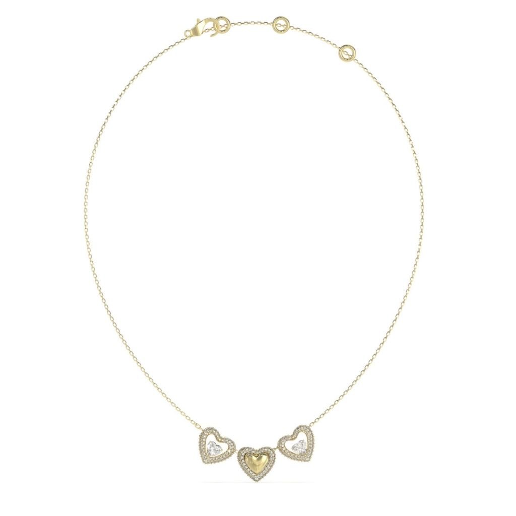 Γυναικείο κολιέ GUESS STEEL χρυσό με σχέδιο τρεις καρδιές, διαφανείς πέτρες ζιργκόν και το λογότυπο της εταιρείας(40,7-45,7cm).