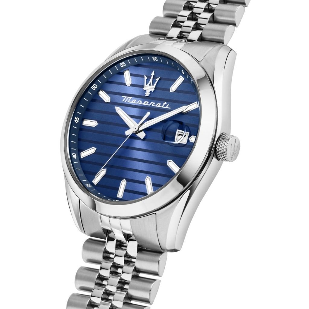 Ανδρικό ρολόι MASERATI ATTRAZIONE R8853151028 διαμέτρου 43mm, με μηχανισμό Quartz Ακριβείας, μπλε καντράν, κάσα και μπρασελέ από ανοξείδωτο ατσάλι.